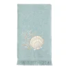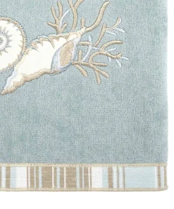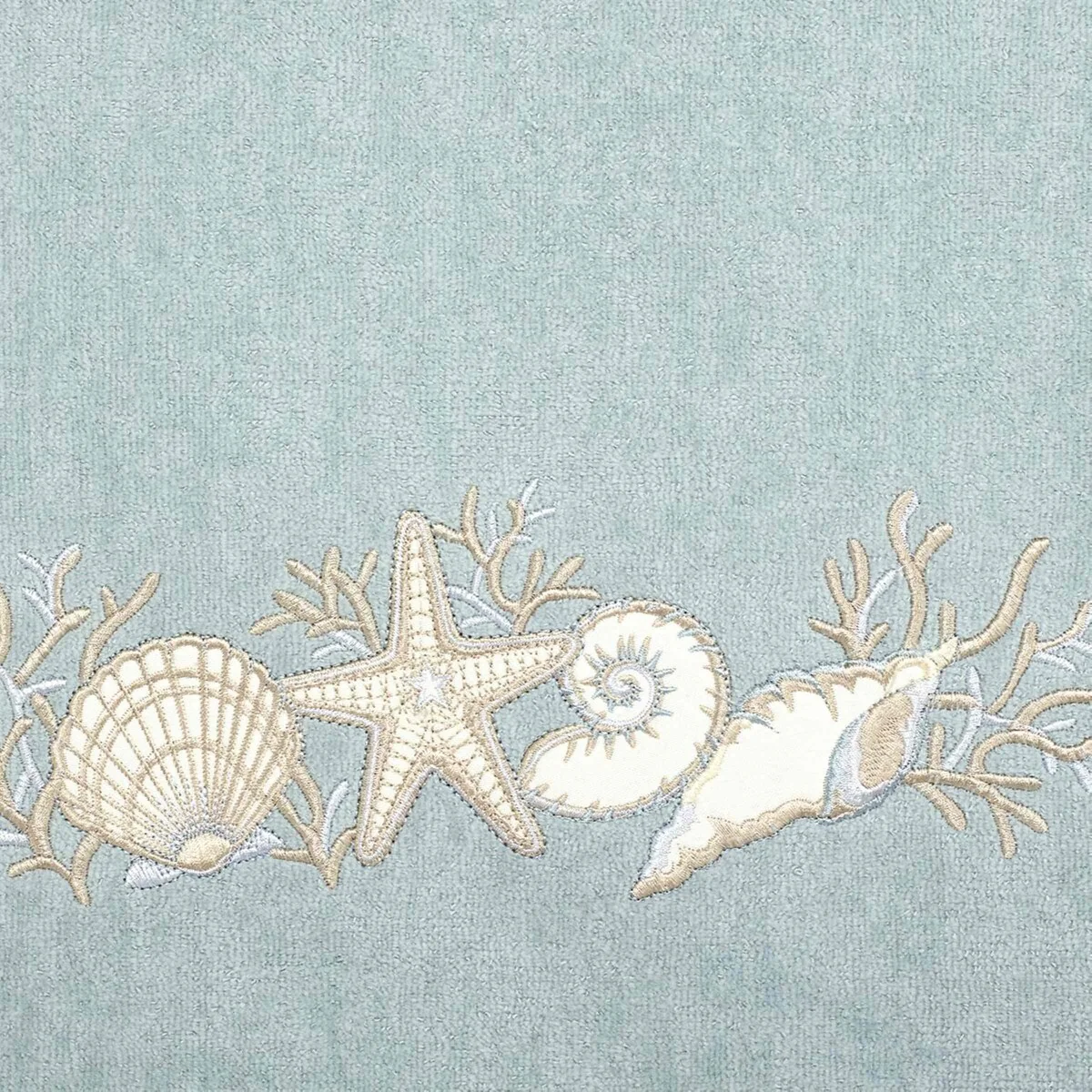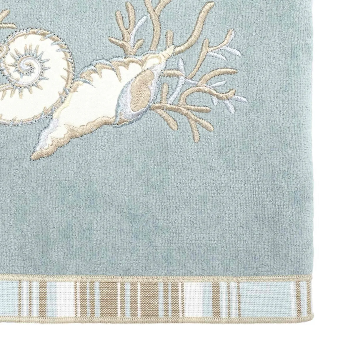 The Avanti Sand Shells Mineral Decorative Bath Towel features embroidered shells, starfish and coral in shades of blue, beige and ivory. The towel is finished with a coordinating striped fabric border. Towel is 27" x 50" 100% cotton mineral velour. Other sizes, colors available.