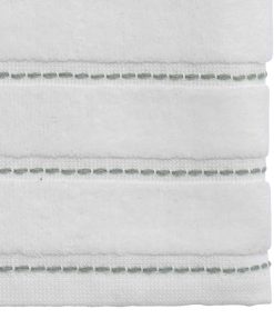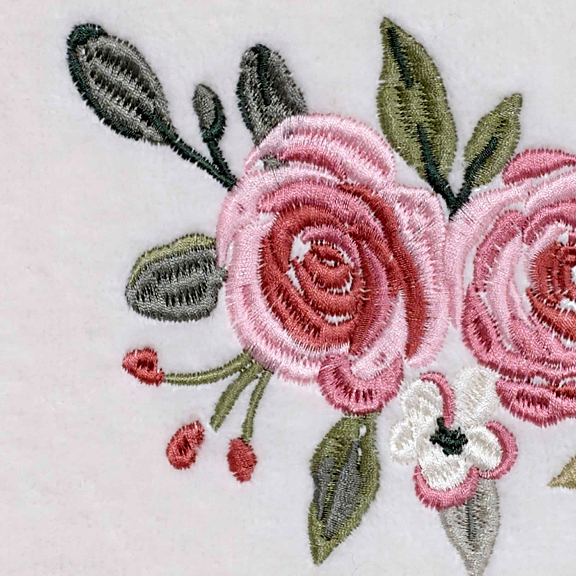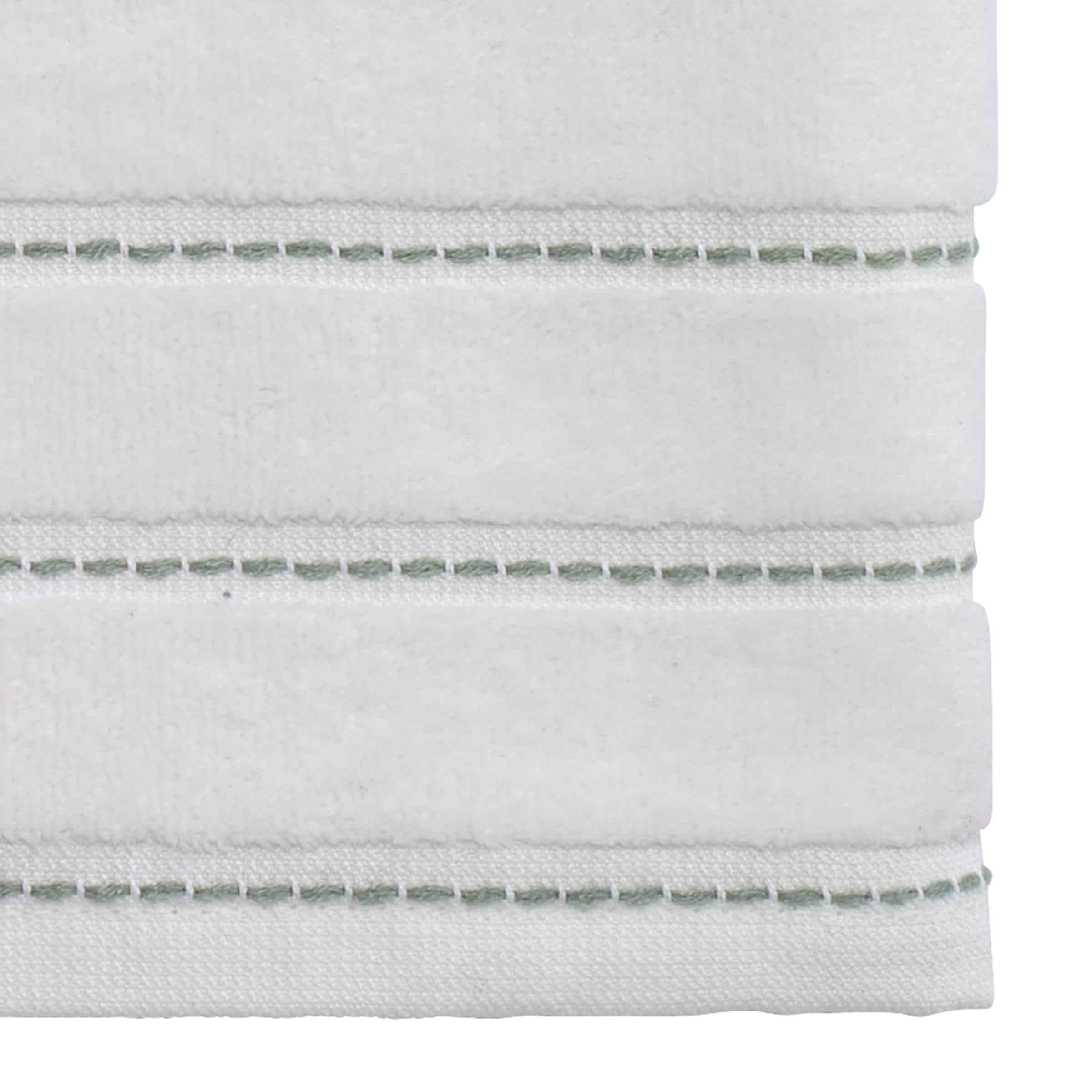 The Avanti Spring Garden Bath Towel is decorated with 3 embroidered peonies in shades of pink with green leaves and woven, yarn-dyed green border stripes on an ivory ground. Made of soft and absorbent 100% ring spun cotton, 27" x 52". Other coordinating pieces also available.