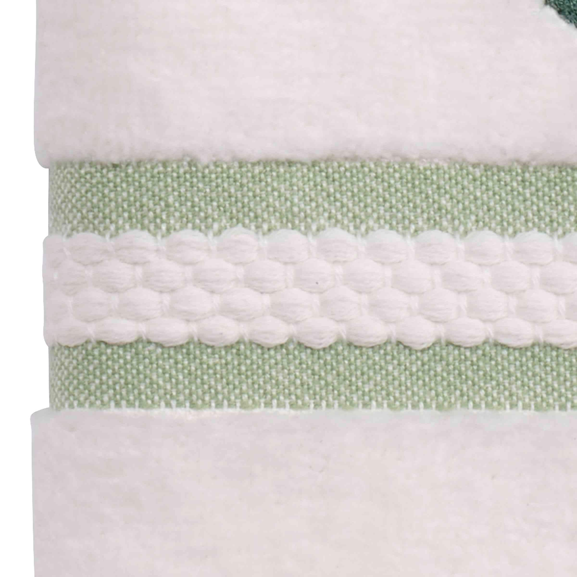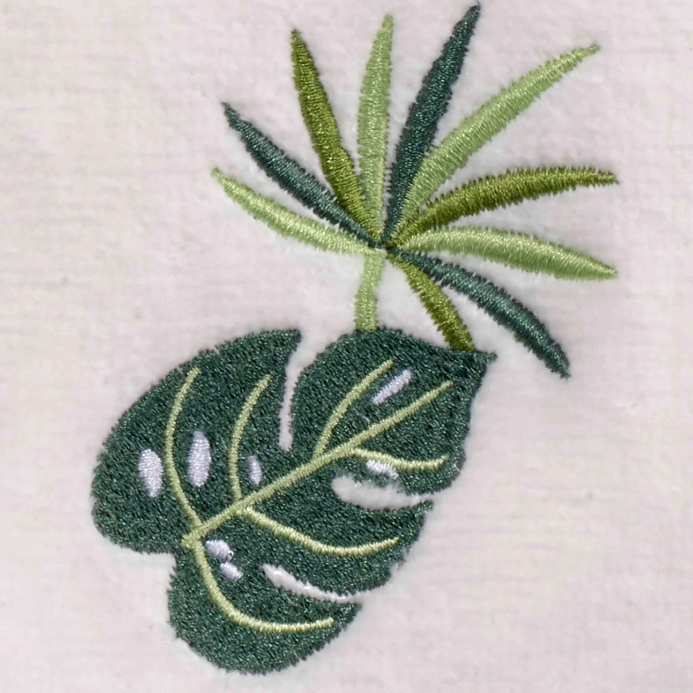 The Avanti Viva Palm Decorative Fingertip Towel features a beautifully embroidered petticoat palm and split leaf philodendron design in various shades of green on a white terry ground. Towel is 100% cotton, exclusive of embellishment, with coordinating green stripes to finish the look. 11" x 18".