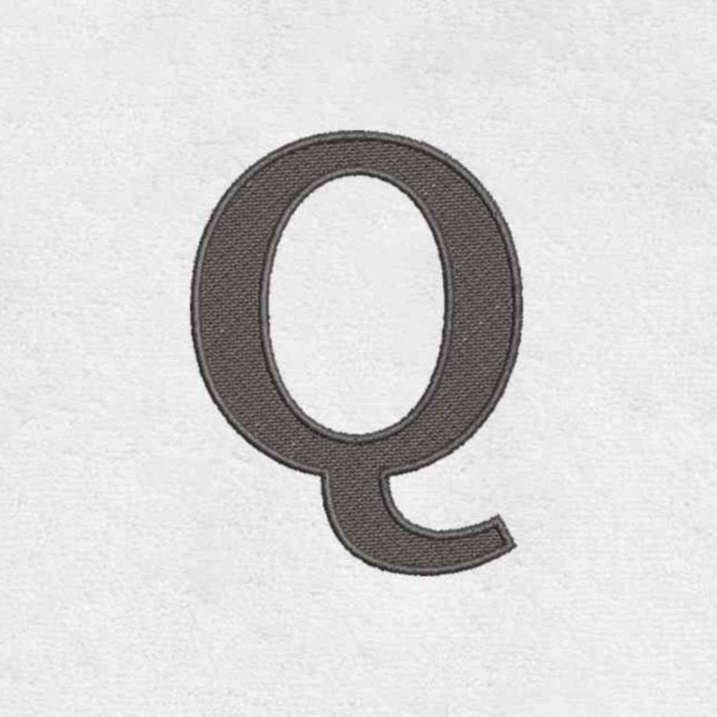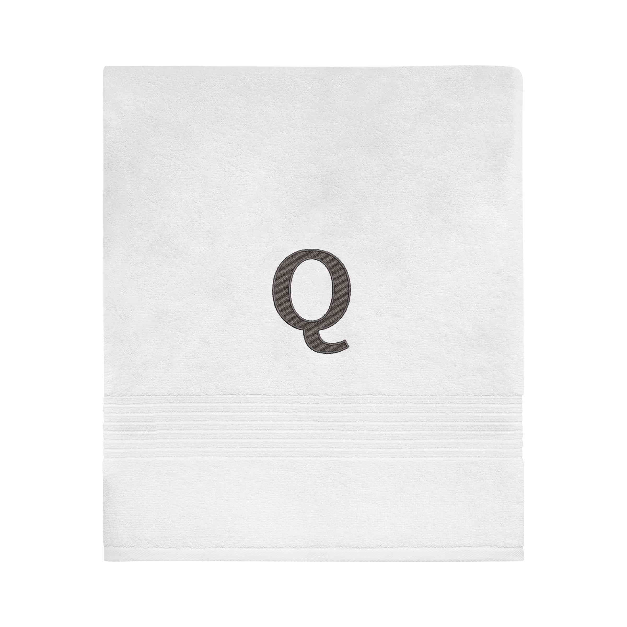 The Avanti White/Grey "Q" Block Monogram Bath Towel features an embroidered dark grey capital "Q" in a modern block font. The 30" x 54" ringspun combed 100% cotton towel features a flat decorative border with terry above and below. Other letters and sizes available.
