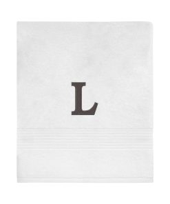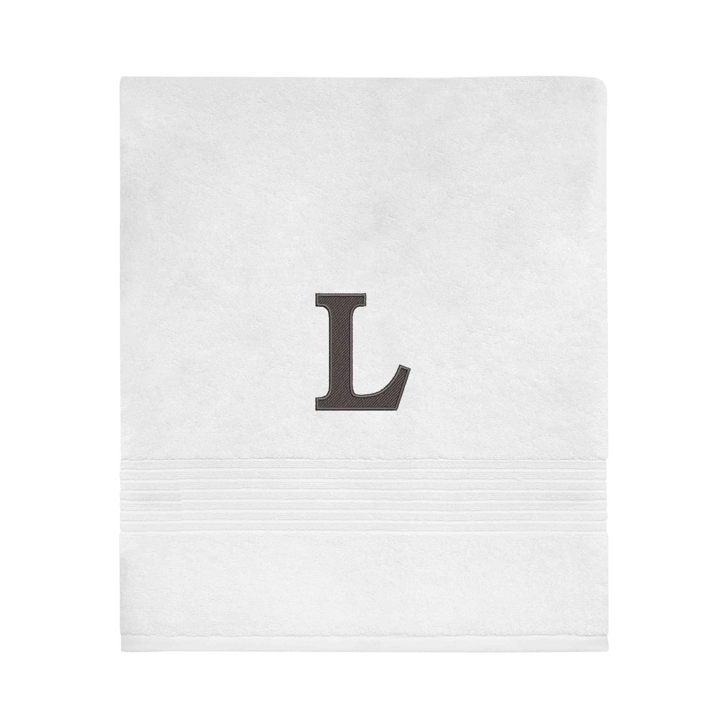 The Avanti White/Grey "L" Block Monogram Bath Towel features an embroidered dark grey capital "L" in a modern block font. The 30" x 54" ringspun combed 100% cotton towel features a flat decorative border with terry above and below. Other letters and sizes available.