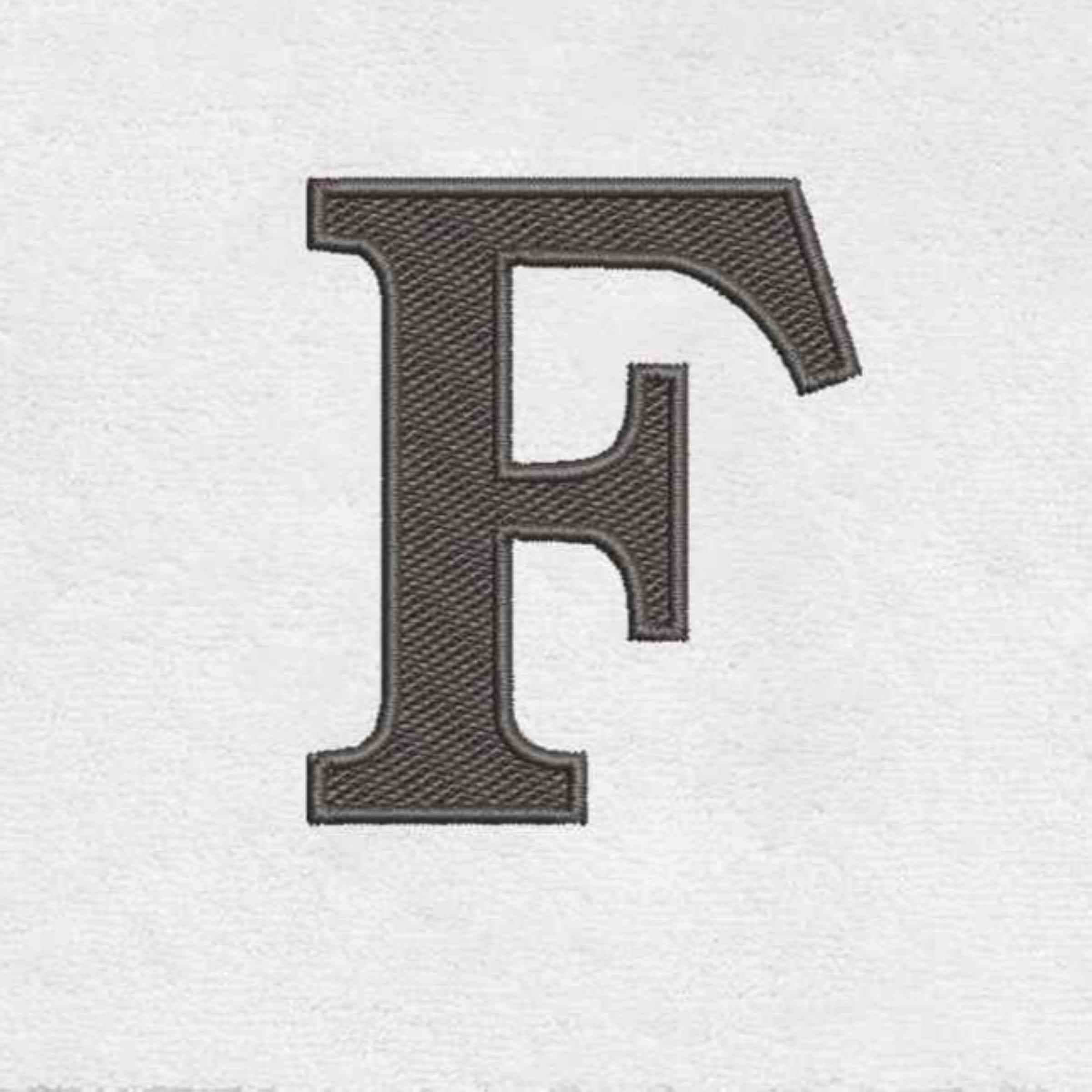 The Avanti White/Grey "F" Block Monogram Bath Towel features an embroidered dark grey capital "F" in a modern block font. The 30" x 54" ringspun combed 100% cotton towel features a flat decorative border with terry above and below. Other letters and sizes available.