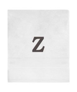 The Avanti White/Grey "Z" Block Monogram Bath Towel features an embroidered dark grey capital "Z" in a modern block font. The 30" x 54" ringspun combed 100% cotton towel features a flat decorative border with terry above and below. Other letters and sizes available.