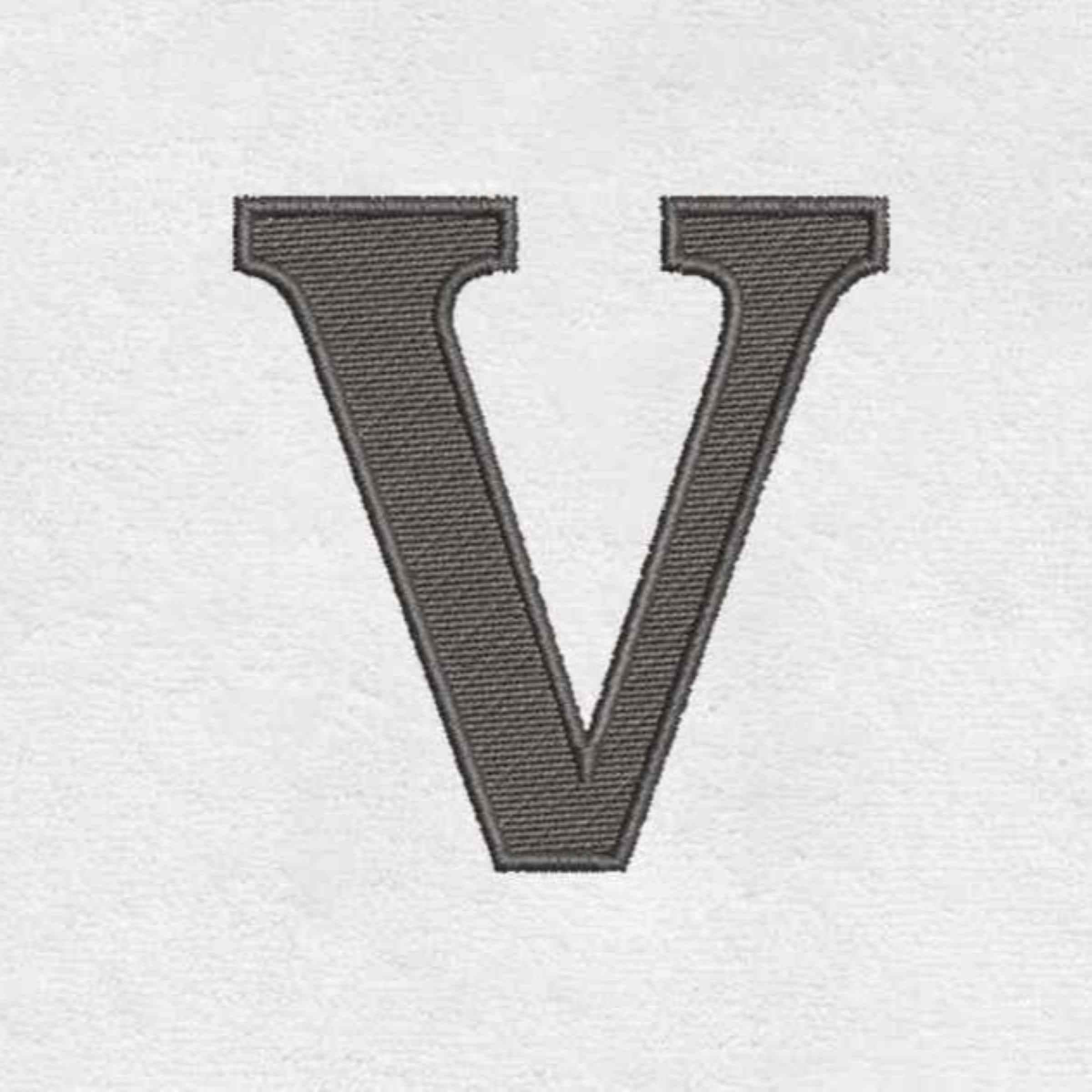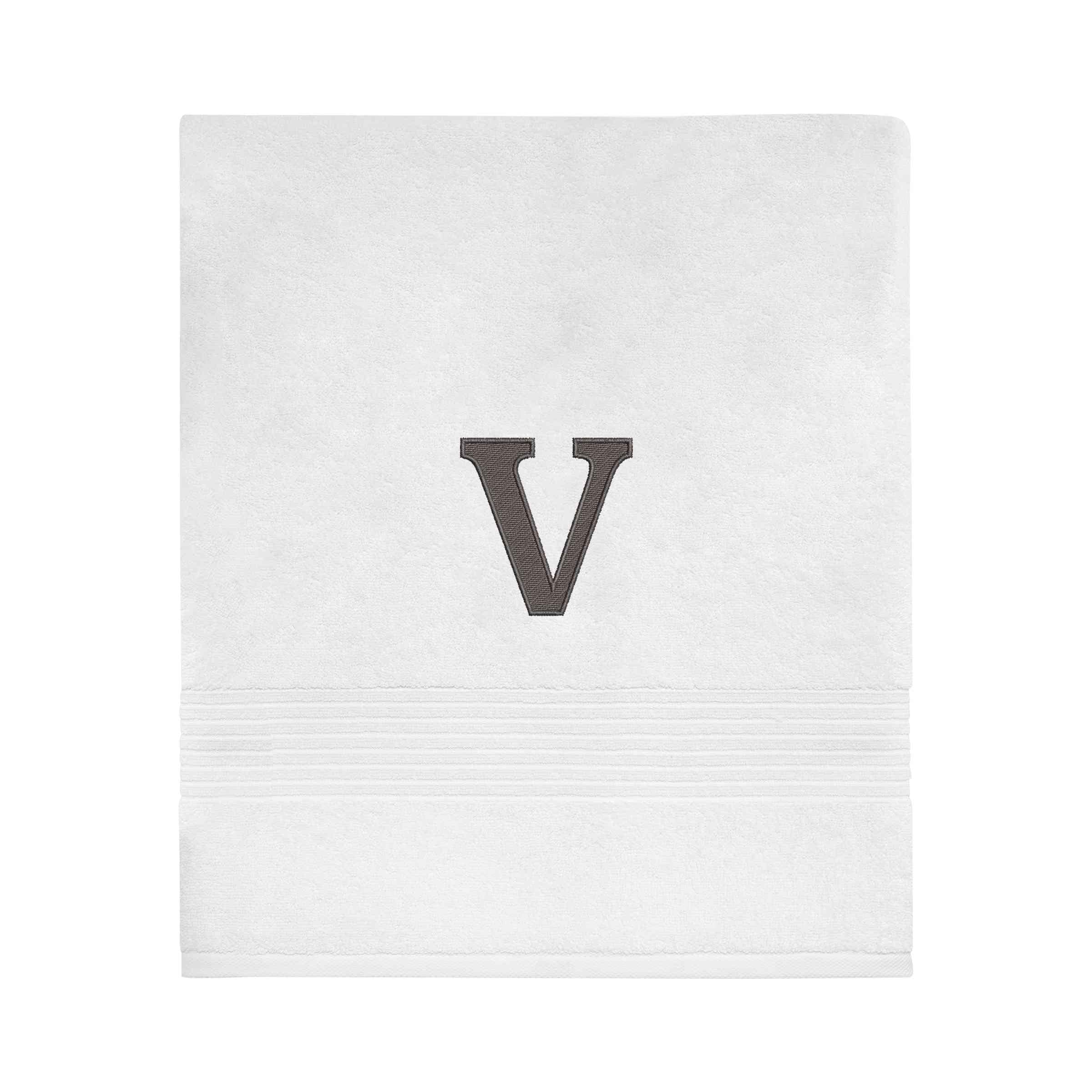 The Avanti White/Grey "V" Block Monogram Bath Towel features an embroidered dark grey capital "V" in a modern block font. The 30" x 54" ringspun combed 100% cotton towel features a flat decorative border with terry above and below. Other letters and sizes available.