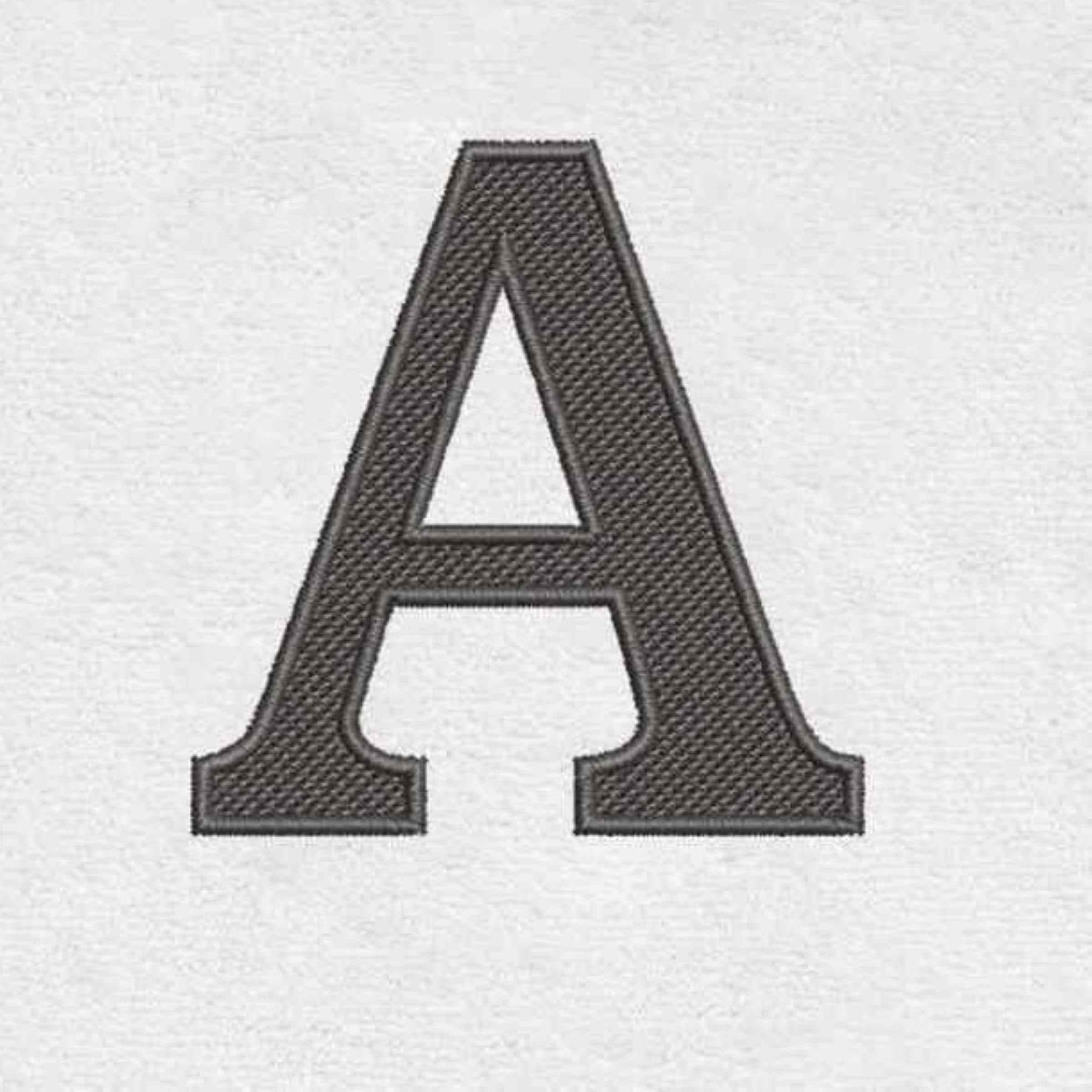 The Avanti White/Grey "A" Block Monogram Bath Towel features an embroidered dark grey capital "A" in a modern block font. The 30" x 54" ringspun combed 100% cotton towel features a flat decorative border with terry above and below. Other letters and sizes available.