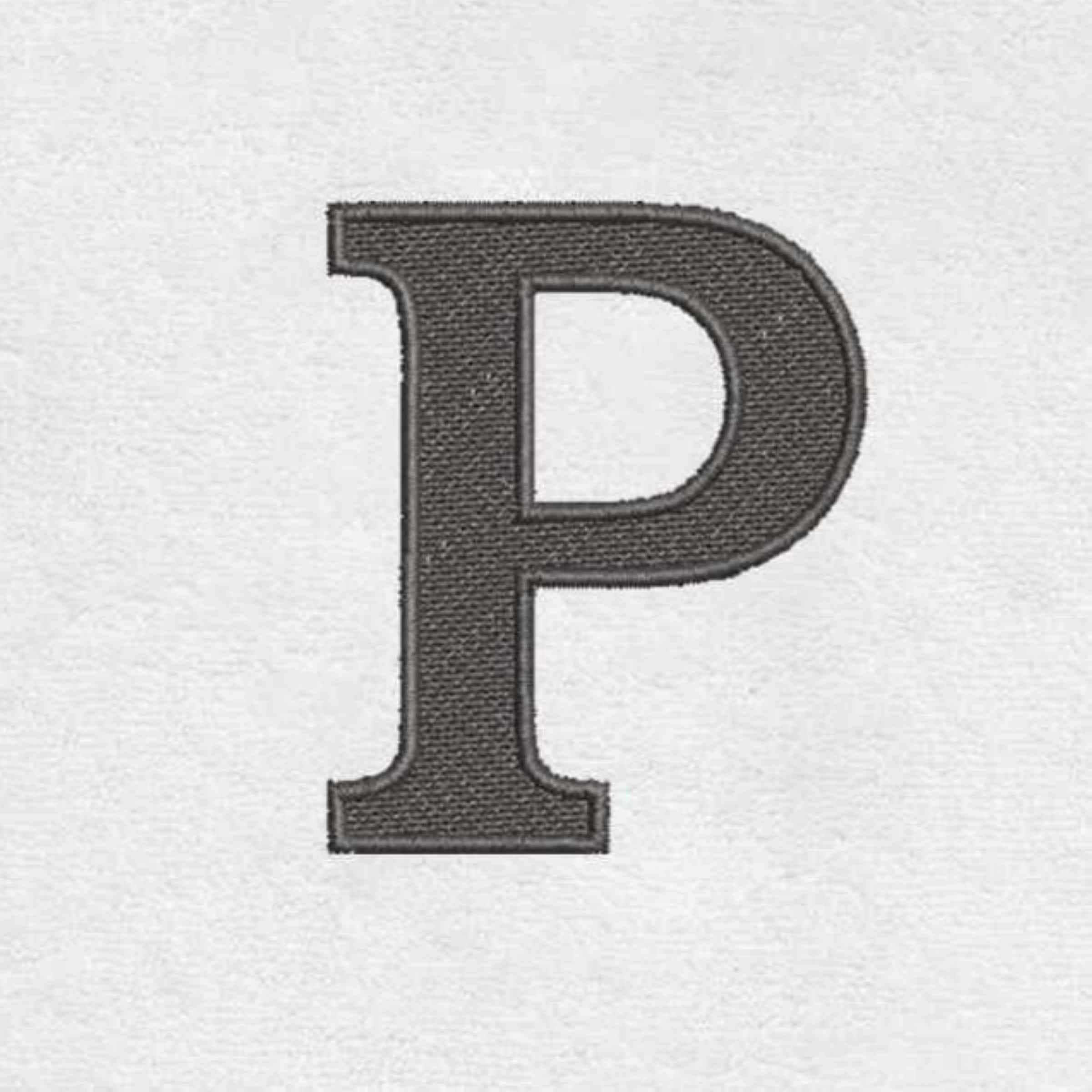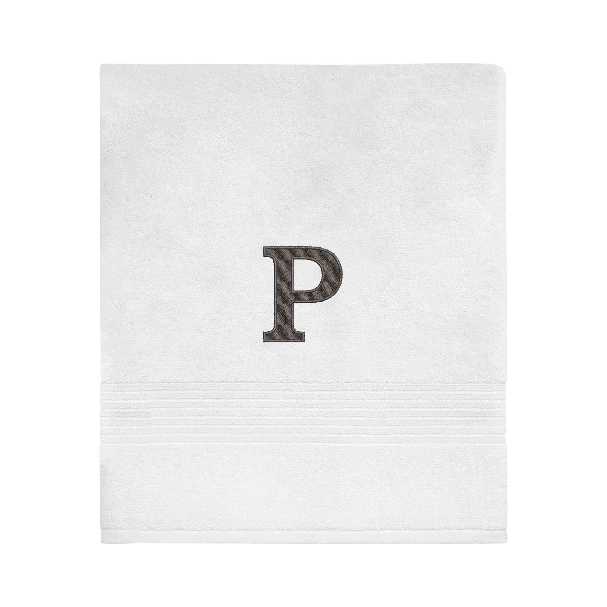 The Avanti White/Grey "P" Block Monogram Bath Towel features an embroidered dark grey capital "P" in a modern block font. The 30" x 54" ringspun combed 100% cotton towel features a flat decorative border with terry above and below. Other letters and sizes available.