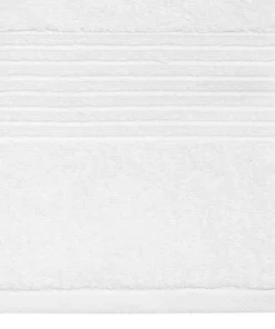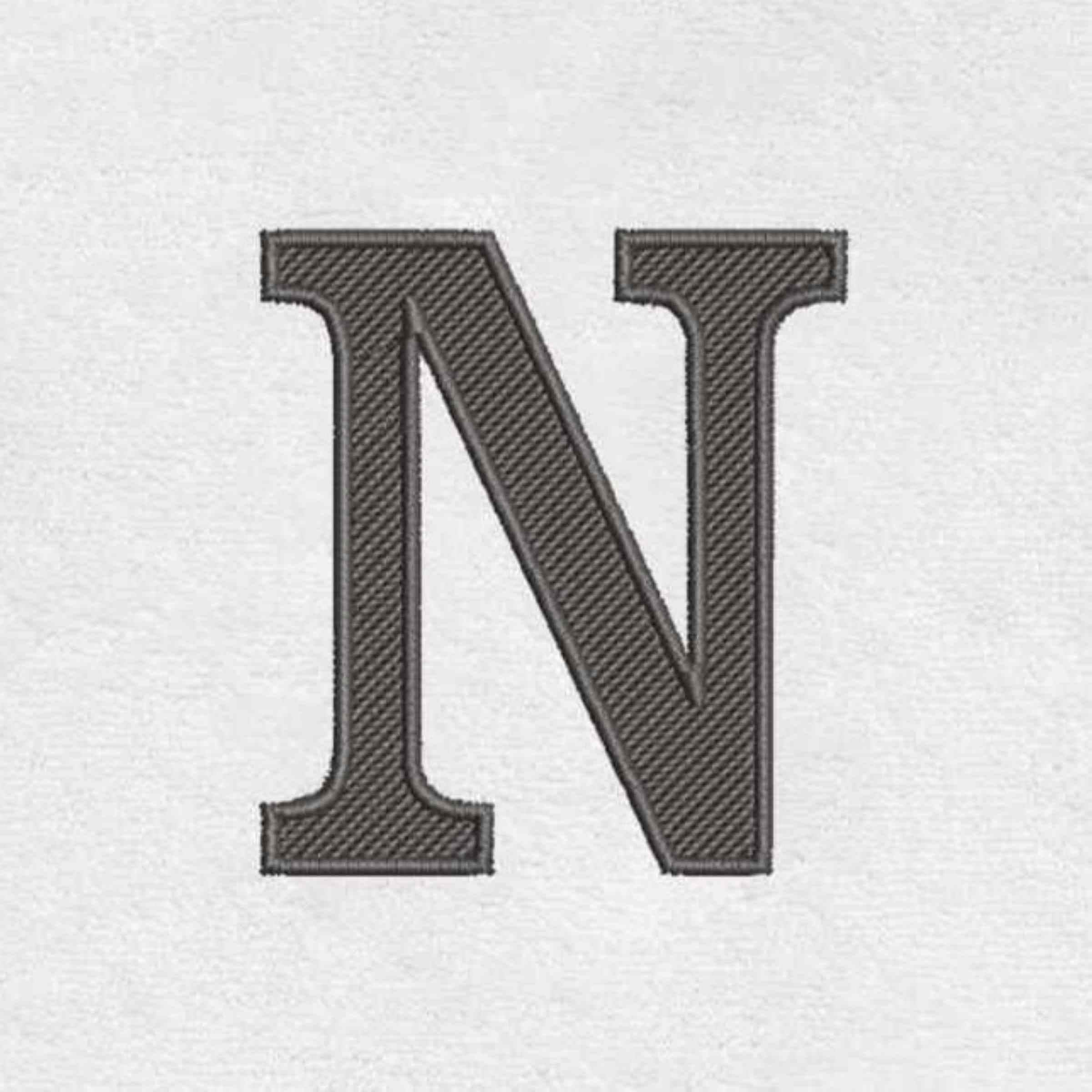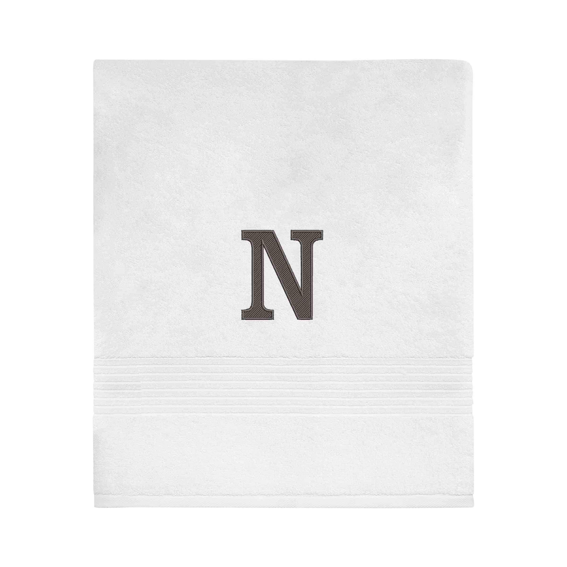 The Avanti White/Grey "N" Block Monogram Bath Towel features an embroidered dark grey capital "N" in a modern block font. The 30" x 54" ringspun combed 100% cotton towel features a flat decorative border with terry above and below. Other letters and sizes available.