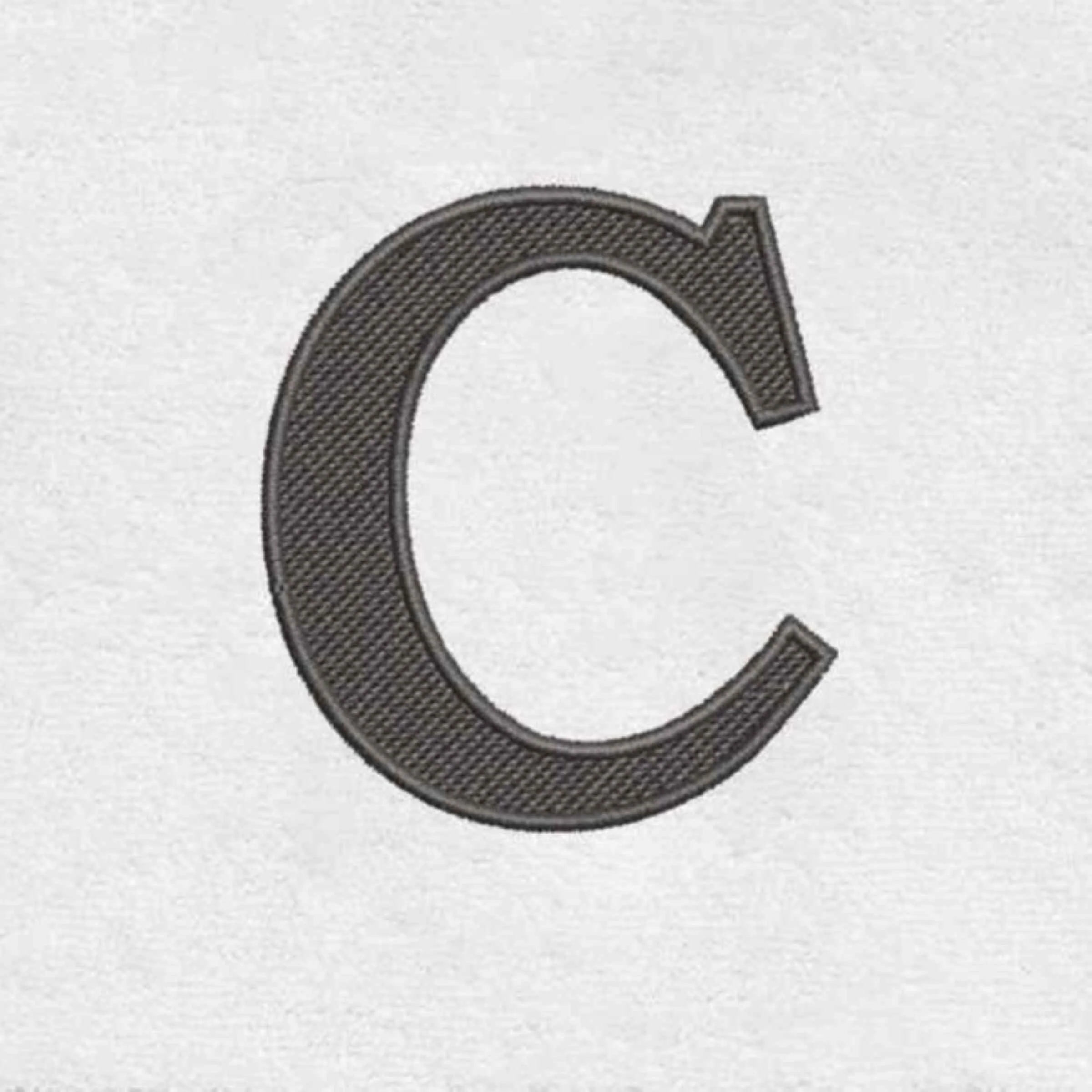 The Avanti White/Grey "C" Block Monogram Bath Towel features an embroidered dark grey capital "C" in a modern block font. The 30" x 54" ringspun combed 100% cotton towel features a flat decorative border with terry above and below. Other letters and sizes available.
