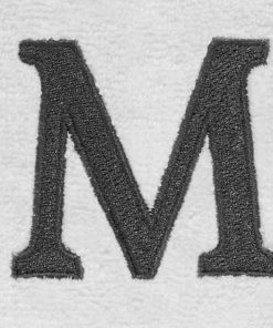The Avanti White/Grey "M" Block Monogram Fingertip Towel features an embroidered dark grey capital "M" in a modern block font. The 11" x 18" ringspun combed 100% cotton towel features a flat decorative border with terry above and below. Other letters and sizes available.