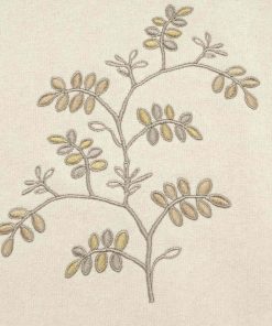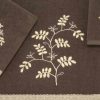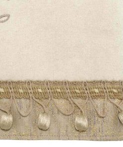 The Avanti Willow Ivory Bath Towel features embroidered gold and taupe branches and leaves on an ivory ground. The towel is finished with a gold and grey shimmering textured trim with braid and ball fringe. The 27" x 50" 100% cotton ivory towel is sheared for a silky, smooth finish.