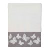 The Avanti Yara Granite Decorative Bath Towel features beautifully embroidered white butterflies on a grey textured polyester fabric border. Towel is 27" x 50" 100% cotton granite velour. Hand and fingertip and other colors also available.