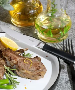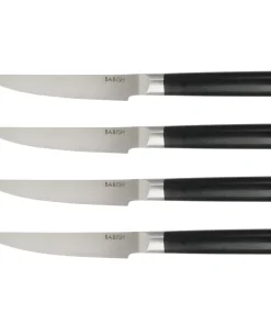 Enjoy premium cuts of meat with the Babish 4-piece Steak Knife Set. Constructed from high-carbon, quality 1.4116 German steel, each steak knife features a precision-forged, full tang blade to sharply slice through meat, poultry, and more. The versatile, sleek design provides everyday elegance at your fingertips while complementing any tabletop piece or place setting. Double-bolstered ABS handles provide strength and balance when cutting. This set is also a beautiful and practical gift for birthdays, housewarmings, or any special occasion. Easy to clean and maintain, these knives are the prime choice for everyday use. Hand wash only. Towel dry immediately.