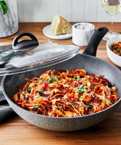Made in Italy, Ballarini Parma infuses the rich tradition of Italian cuisine into easy-to-use pans for everyday cooking. The revolutionary speckled Granitium nonstick coating boasts quick release for effortless cooking. Appealing to the eye, this ultra durable coating has a heart of stone – it is fork-proof, metal-safe and extremely scratch-resistant, increasing the lifespan of your pan. The easy-to-clean surface ensures that no time is wasted on washing and more time can be spent on cooking. Ballarini’s innovative Thermopoint heat-sensitive handle turns red when hot and green when cool. This lets you know when the pan’s temperature is just right for cooking – preventing unnecessary overheating or undercooking – and properly cooled off for cleaning. Made from the most pure aluminum in the industry, the fry pan’s cold forged body heats up rapidly and evenly with no hot spots. Three times more energy efficient than cast iron, aluminum is also wonderfully light, eliminating any arm strain. The ergonomic, stay cool handle offers a comfortable grip for maximum control. With Ballarini, experience the ease of nonstick expertise.