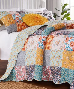 Brighten up your bedroom with the Carlie Calico Reversible Cotton Quilt and Pillow Sham Set by Barefoot Bungalow. Featuring an eclectic blend of dreamy calico patterns in the latest fashion colors, Carlie creates a bright, cheerful mood. Choose from Calico Patches, with scalloped edges and a poppy print reverse, or Calico Stripes with whimsical birds and a stylized geometric print reverse. Each reversible pillow sham has a side zipper opening to hold your pillow in place. Machine washable.