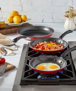 Basic Essentials 8PC Carbon Steel Cookware Set with Bakelite Handle – Red