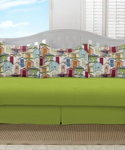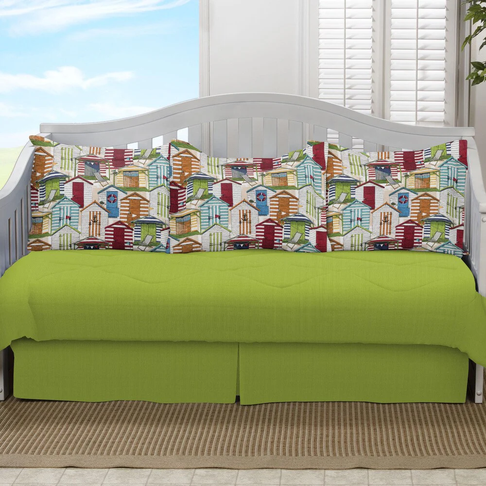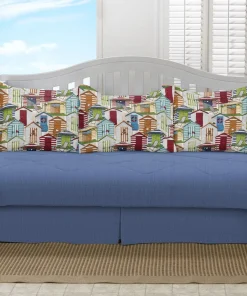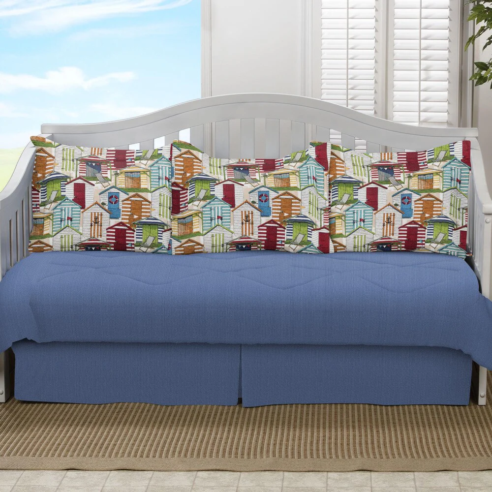 Make your home look peaceful and inviting with this coastal 5-piece daybed set. The cool blue color of the comforter and bedskirt is offset by the lively pillow shams, which feature a print depicting multi-colored beach houses. This polyester and cotton set is completely machine washable.
