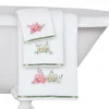 This set of 3 beautifully embroidered cotton towels includes a washcloth, hand towel and bath towel, each with satiny ribbons bordering the bottom. Machine wash. Cotton; imported. Washcloth 12"Sq., hand towel 16"W x 25"L, bath towel 24"W x 48"L. 3-Piece Set. Choose: Blue or Sand.