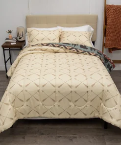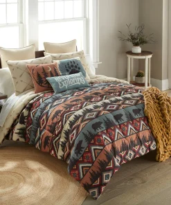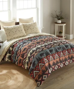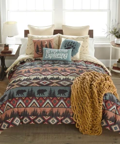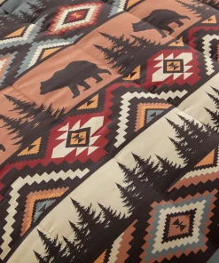 The Bear Totem 3pc polyester comforter bedding set from Your Lifestyle by Donna Sharp features a striped Northwest pattern arranged horizontally. Bears and pine tree silhouettes alternate throughout. Â Colors include sage, mahogany, ivory, gold, orange and deep red. The reversible lining is an arrow pattern on ivory. Set includes a comforter and 2 pillowcases. Image on pillowcases may vary.Â