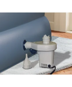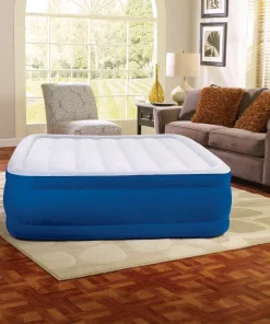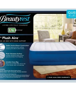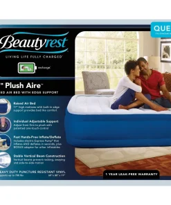 The Beautyrest Plush Aire 17 inch high Queen size air mattress with built-in edge support helps to stabilize the side of the mattress. The plush velveteen cover ensures your bedding stays in place. The stable vertical beam construction helps to prevent rocking, swaying and side-to-side motion. This mattress will contour and support your body for a great nights sleep. With the patented one touch control you can adjust your individual comfort and support from firm to plush. Comes with a fast hands-free inflate-deflate electric express pump that deflates in seconds for storage. Â