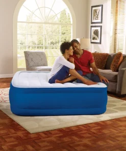 The Beautyrest Plush Aire 17 inch high Queen size air mattress with built-in edge support helps to stabilize the side of the mattress. The plush velveteen cover ensures your bedding stays in place. The stable vertical beam construction helps to prevent rocking, swaying and side-to-side motion. This mattress will contour and support your body for a great nights sleep. With the patented one touch control you can adjust your individual comfort and support from firm to plush. Comes with a fast hands-free inflate-deflate electric express pump that deflates in seconds for storage. Â