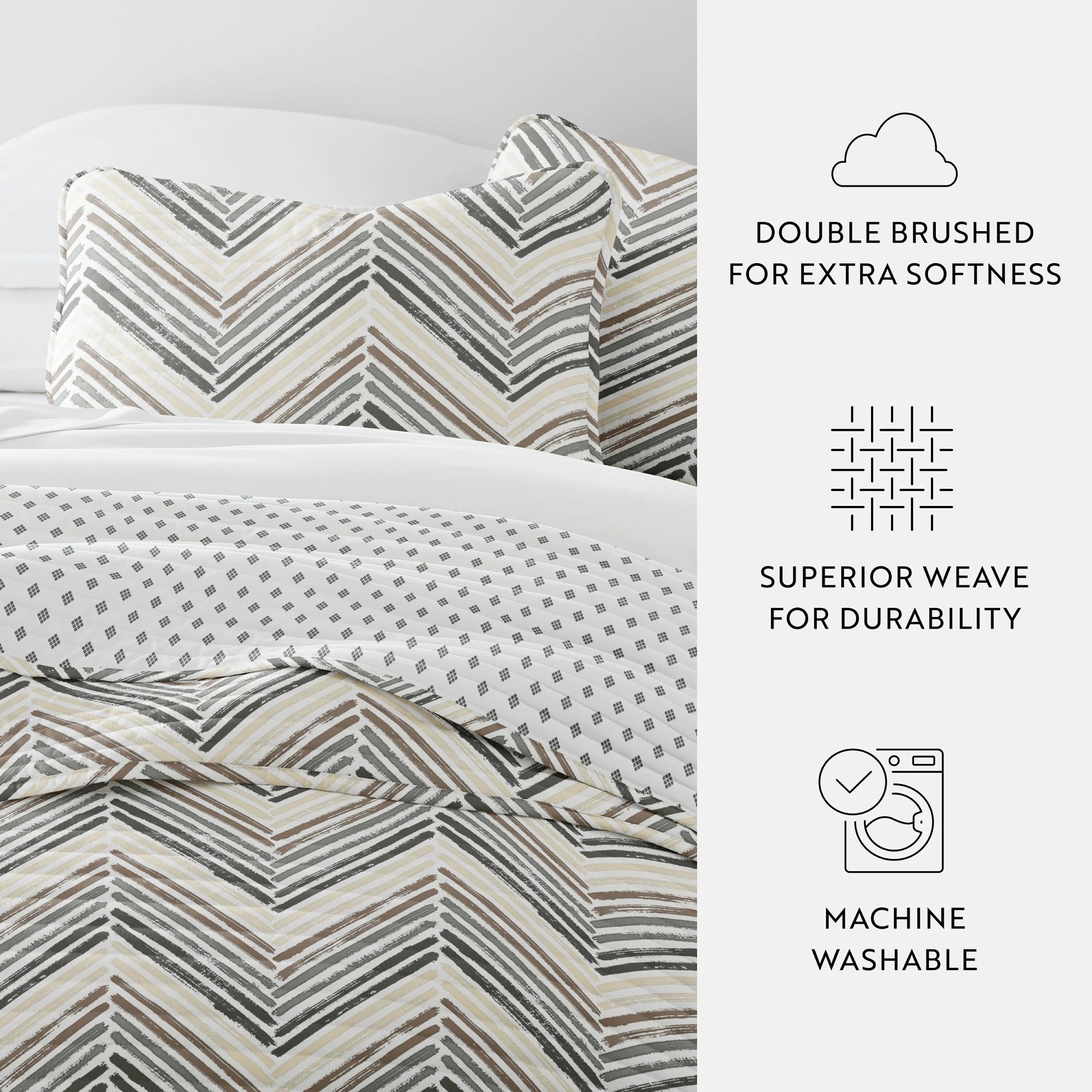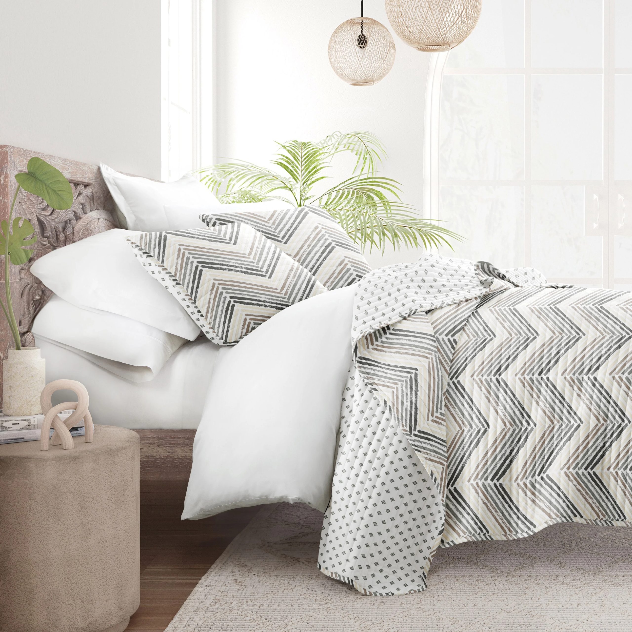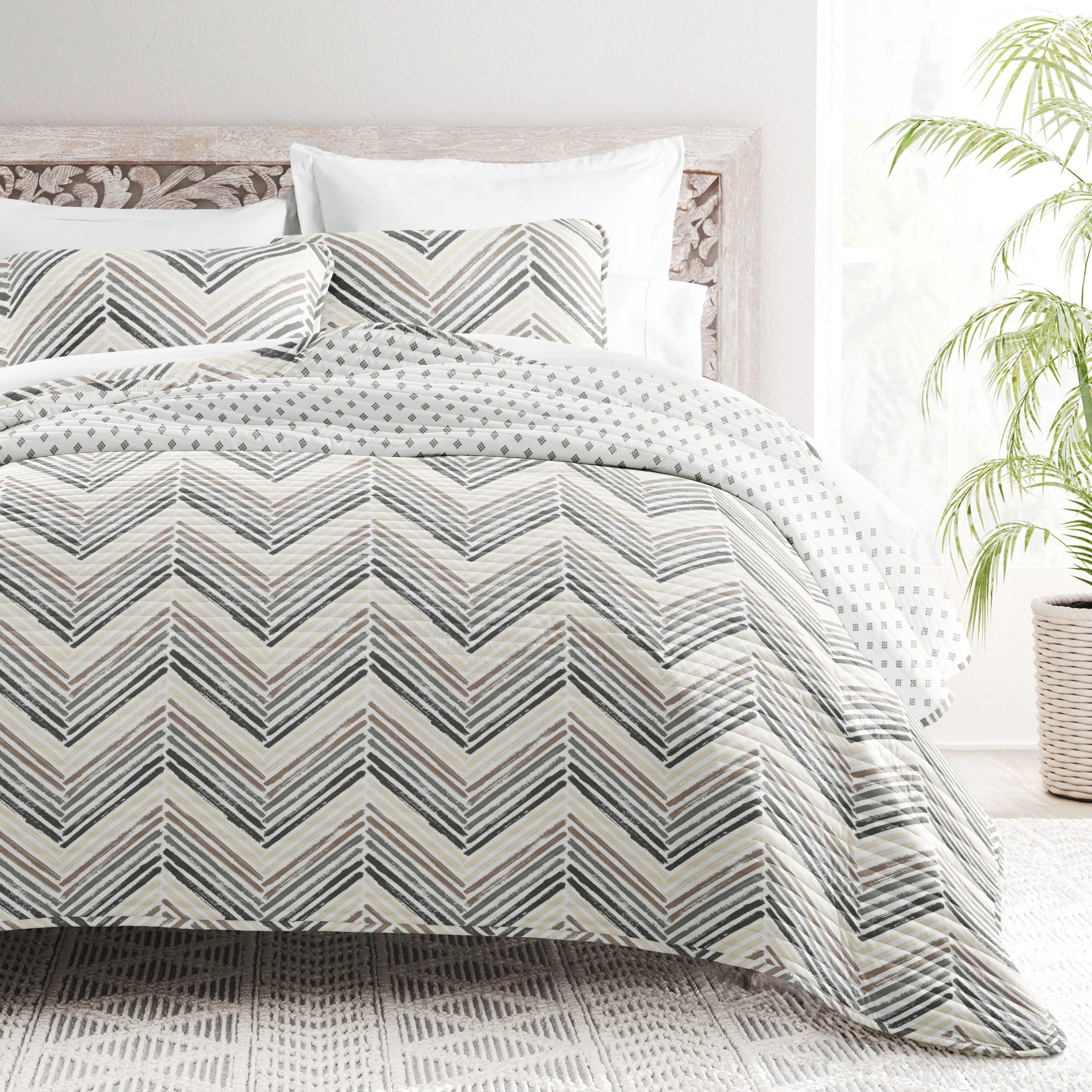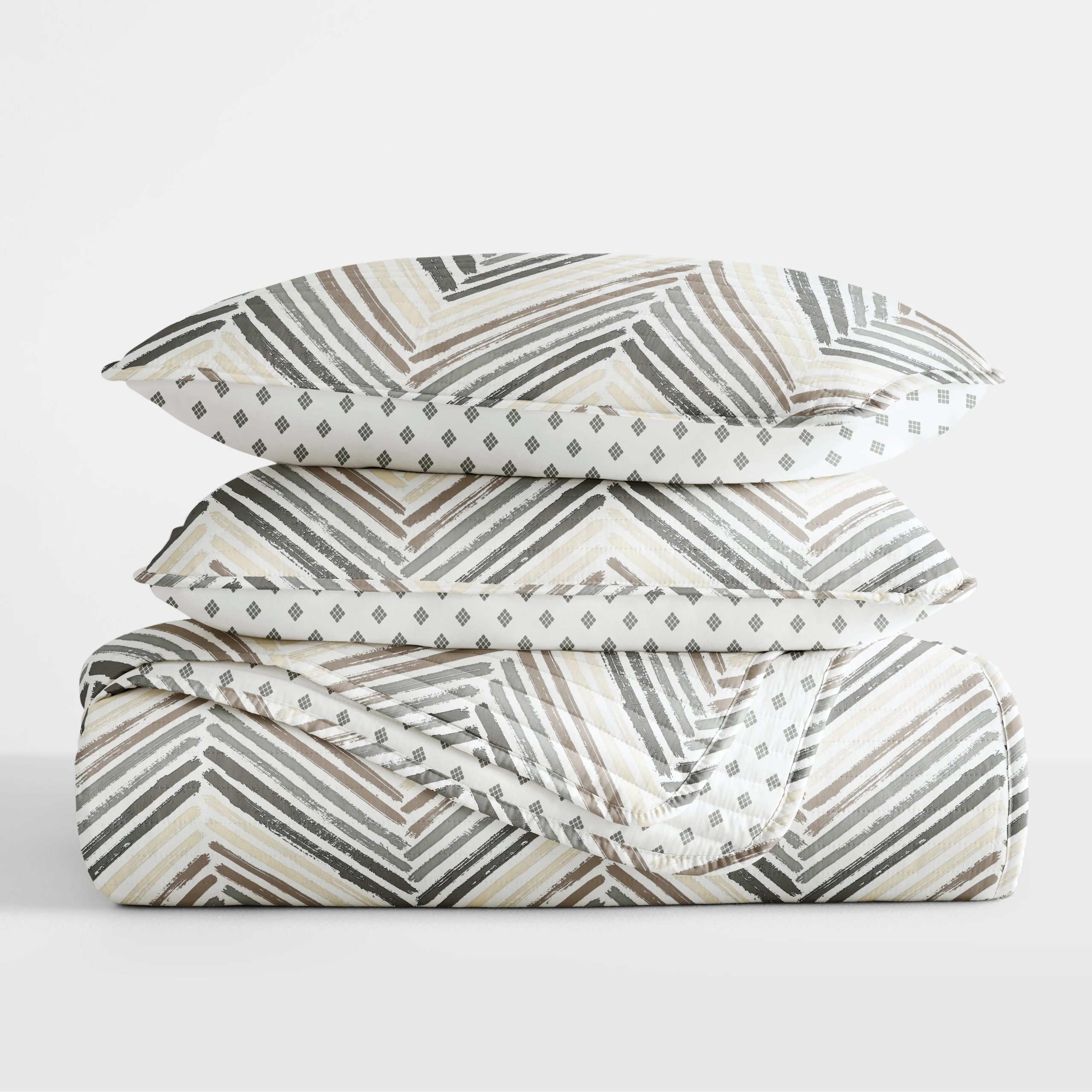 Add a cozy yet stylish touch to your bedroom with this Becky Cameron All Season 3 Piece Diamond Chevron Reversible Quilt Set with Shams. Made from 100% imported 95 GSM microfiber, the quilt features a geometric print with a painted chevron pattern in neutral tones and is double-brushed for an incredibly soft and cozy feel. The subtle quilting lines add dimension to the quilt while the reversible design allows for versatility in styling. This quilt set is also filled with artificial down, making it a great option for those with allergies or sensitive skin.