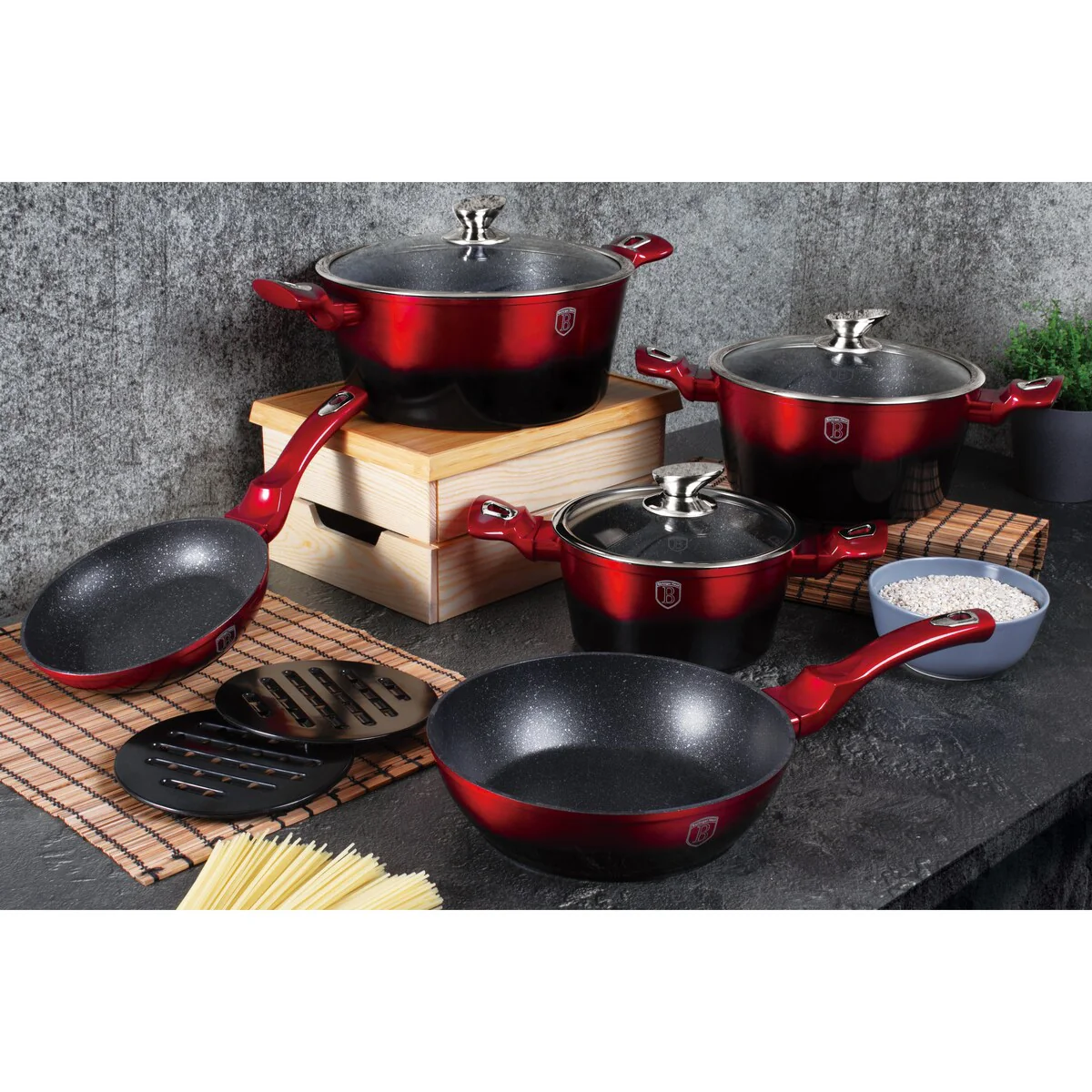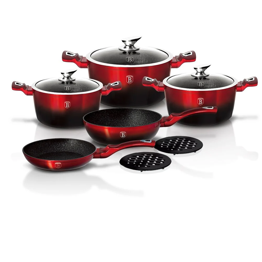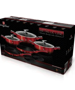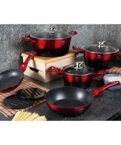 Craft healthy meals and high-end dishes with ease using the Berlinger Haus 10-Piece Kitchen Cookware Set Burgundy Collection. Made from durable, commercial-grade forged aluminum with a triple-coated non-stick surface, this set will elevate the look of your kitchen while providing superior performance. The heat-resistant, soft touch handles make it easy to handle, while the precision fit tempered glass lids help retain moisture and heat. Available in a range of luxury colors, this cookware set is perfect for everyday use or special occasions.