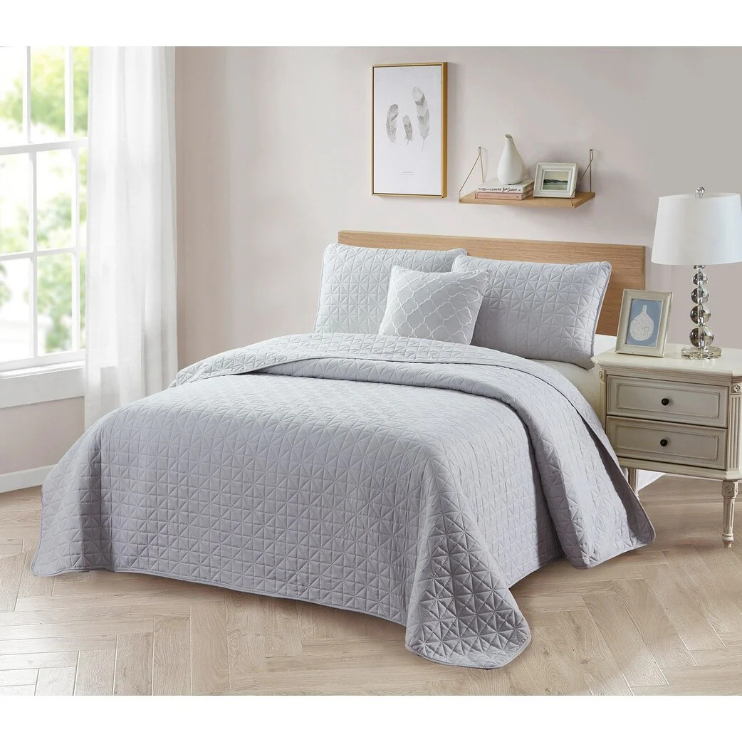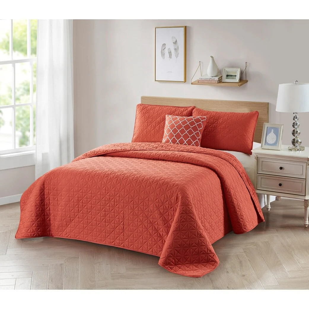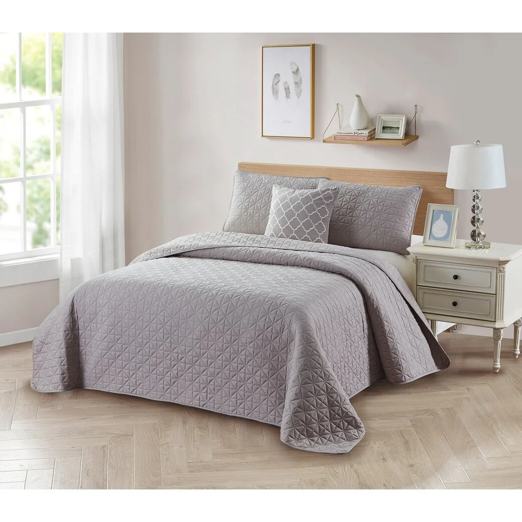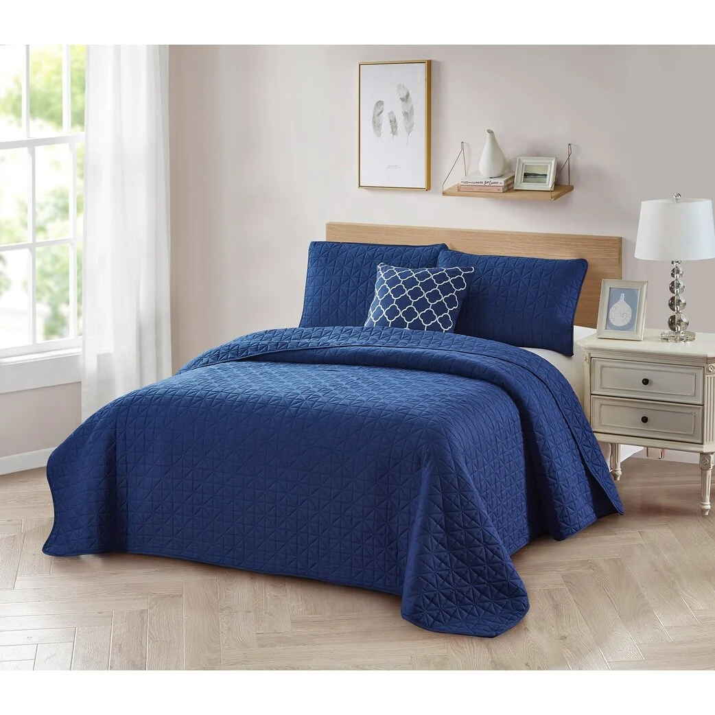 This Bibb Home 4-Piece Diamond Quilt Set is a perfect choice for homeowners with a sophisticated taste in home decor. Adding an extra layer of style and freshness in your bedroom can help coordinate home decor with country, rustic, coastal or any other casual decorating style. Modern design of artistic quilts will absolutely add some tremendous dreams to your sleep. The color coordinated cushion completes the look with a modern quatrefoil embroidery. Our reversible quilt set is lightweight, thus perfect for summer use or as a winter topper with blankets underneath. We utilize high strength fabric on all three layers to ensure the long-term usage which resists fade, stain and pill less than other materials like cotton. Features