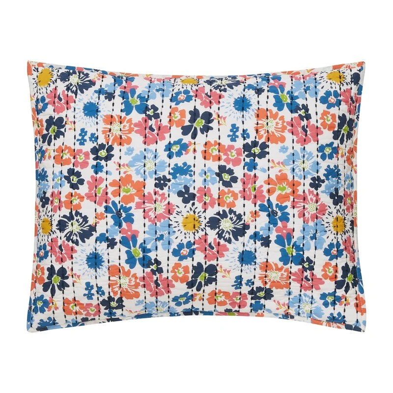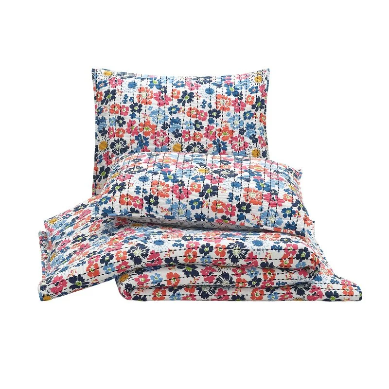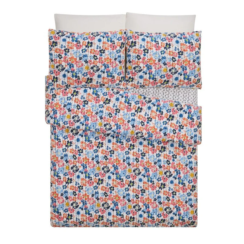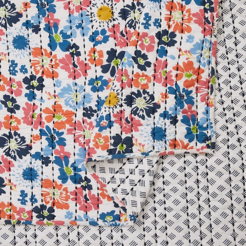 Bring the beauty of a blossoming garden right into your bedroom. This charming quilt set features a nostalgic yet contemporary floral design in shades of blue, green, pink, and orange against a white backdrop. The reverse is a simple blue geometric pattern on a crisp white ground, offering versatile styling options. Crafted entirely from 100% cotton fabric and fill, this quilt set ensures softness, breathability, and comfort. Kantha-inspired quilting completes the design by adding an artisanal touch.
