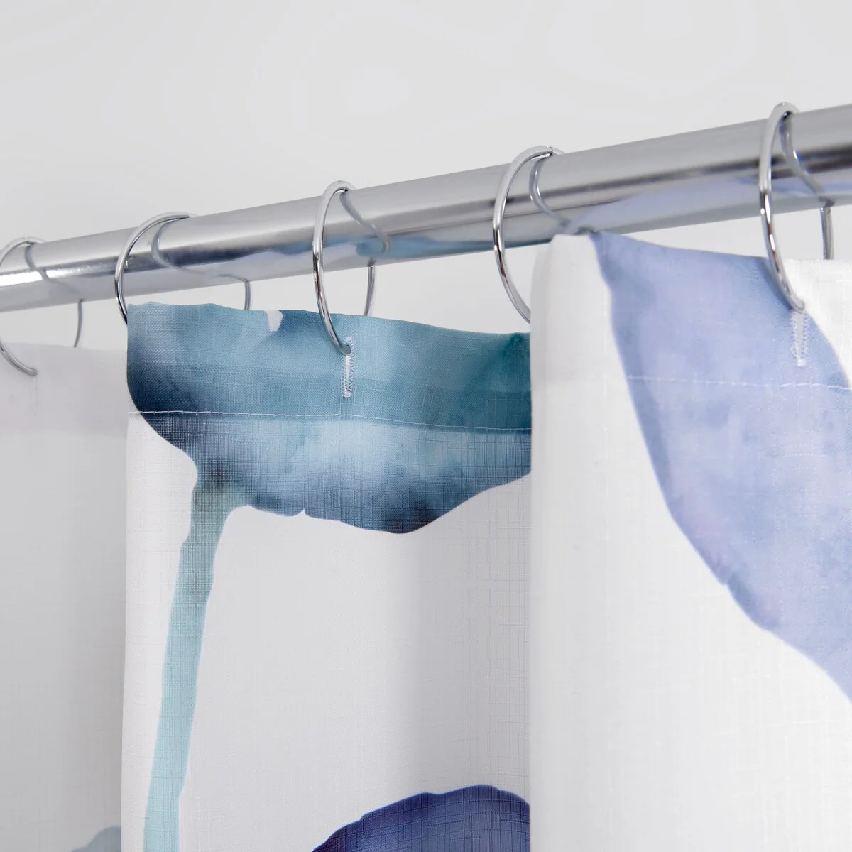 Give your bathroom a refreshing makeover with the Botanical Shower Curtain by Allure Home Creation. This beautiful, oversized print, in soothing cool watercolor shades on a white background, features a flowing array of abstract leaves. The soft, relaxed feeling of this design will bring a feeling of calm to your peaceful bathroom retreat. This shower curtain measures 70" x 72" and fits most standard sized tubs and shower areas providing privacy and protection from water splashing onto the floor. Crafted from 100% easy care polyester taffeta fabric with a reinforced buttonhole top that works well with standard shower hooks and curtain rods. Use of a liner is recommended. Machine wash and tumble dry on low heat. Complete the look by coordinating with other pieces in the Botanical Bath Collection or use alone.