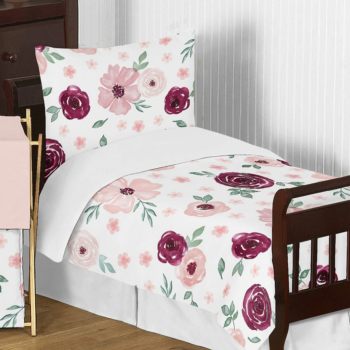 Bring a touch of elegance and sophistication to your child’s room with the Burgundy and Pink Watercolor Floral Girl 5pc Toddler Comforter Set by Sweet Jojo Designs. Featuring a beautiful hand-painted watercolor floral print and a pink daisy blossom flower print, this set boasts a stunning color palette of burgundy, wine, maroon, green, white, and shades of pink. Made from exclusive brushed microfiber fabrics, this toddler bedding collection is not only stylish but also comfortable. The set includes a comforter, pillow sham, fitted sheet, flat sheet, and pillowcase that fit all standard toddler beds. Enjoy easy care and repeated use as this set is machine washable.