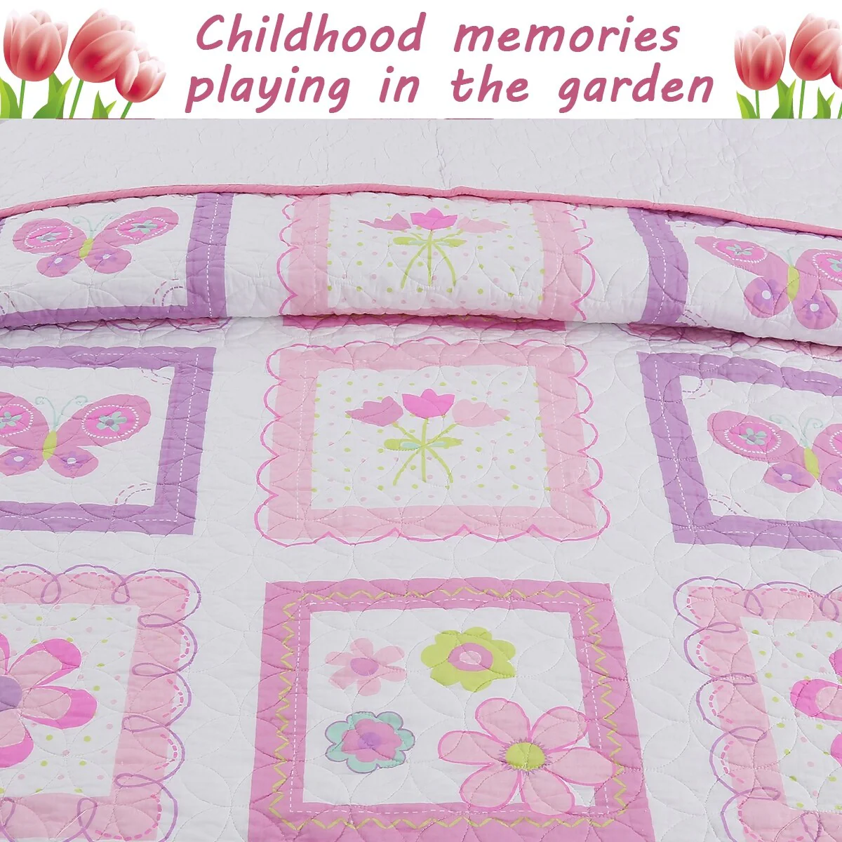 Cheer up your sleeping space or quest space with this colorful, whimsical modern floral and butterfly quilt set pattern so fun it reminds you of childhood memories playing in the garden. With wonderful sprouts of various shade combinations of pinks, purple, green on white background featuring beautiful floral blooms of tulips, daisies, and cute little butterflies. This quilt set is crafted of 100% Cotton. This quilt will give your sleeping space a cool, spontaneous look. Quilt is reversible so that you can quickly and easily change the look of your room. Set offered in Twin (with & without decor throw pillows) and perfect for little girls. Coordinating accessories also available for purchase separately Décor Throw Pillows. With its easy-care machine washable quilt bedding set and spot clean décor throw pillows cotton material.