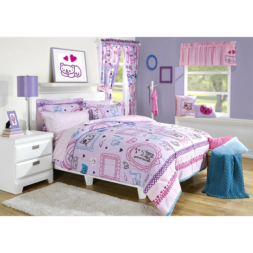 - Set includes: One (1) comforter, one (1) pillow, two (2) shams (one in twin), one (1) decorative pillow, also available with one (1) valence