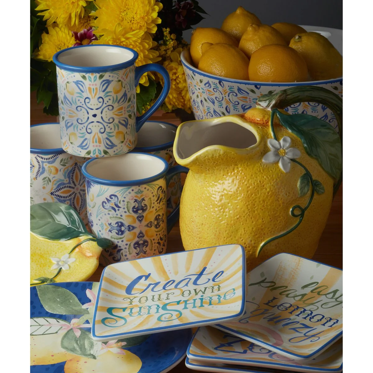 Fresh lemons on rich deep blue coordinate with beautiful tile designs in this fun ceramic collection, "Lemonade", from Certified International. Featuring artwork by Dina June, these wonderful mix and match pieces with assorted decors include dinnerware, serveware, storage and 3-d lemon shaped handpainted serveware . The 3-d lemon pieces are decorative yet functional additions to any kitchen or dining room.