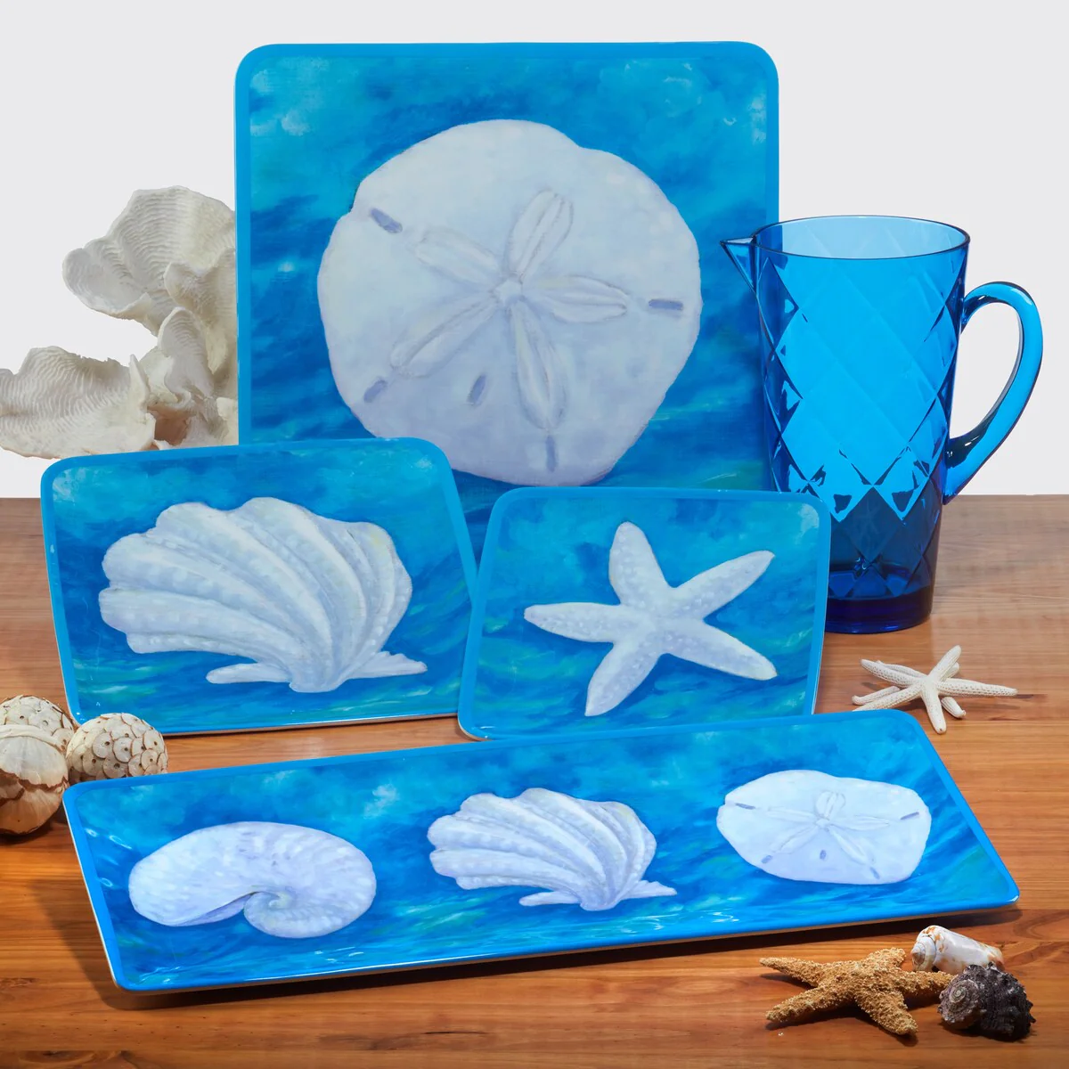 A brilliant blue ocean forms the backdrop for shiny white shells on Certified International’s "Ocean Beach" melamine collection. Each shell is framed on mix and match dinnerware and serveware designed by the artist Paul Brent. Perfect for indoor and outdoor dining, the 100 % melamine items are heavyweight and durable. Great for decorating too!