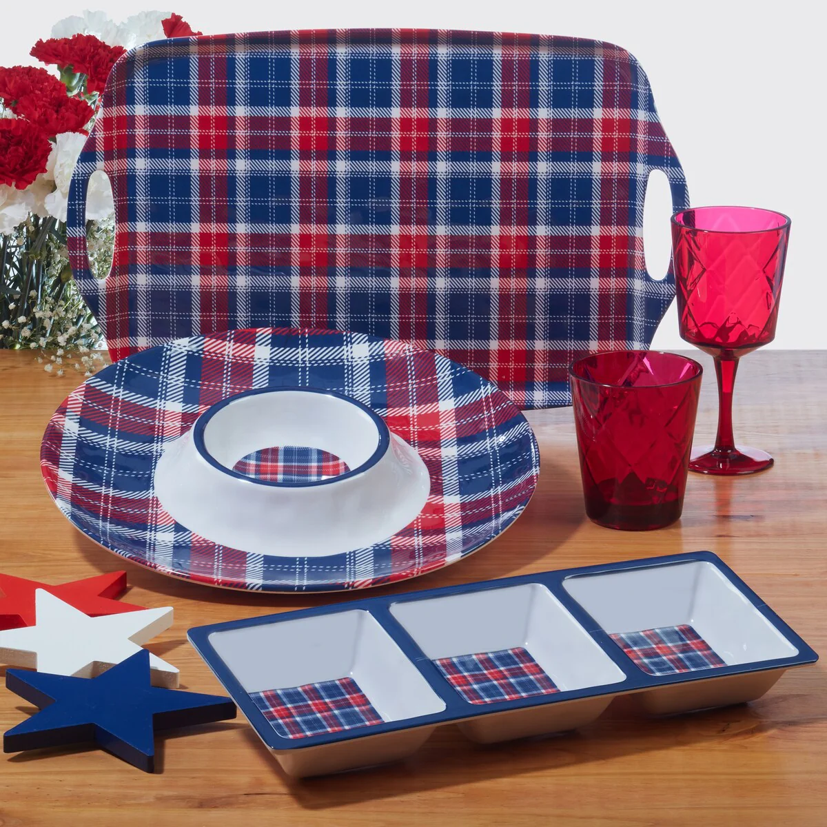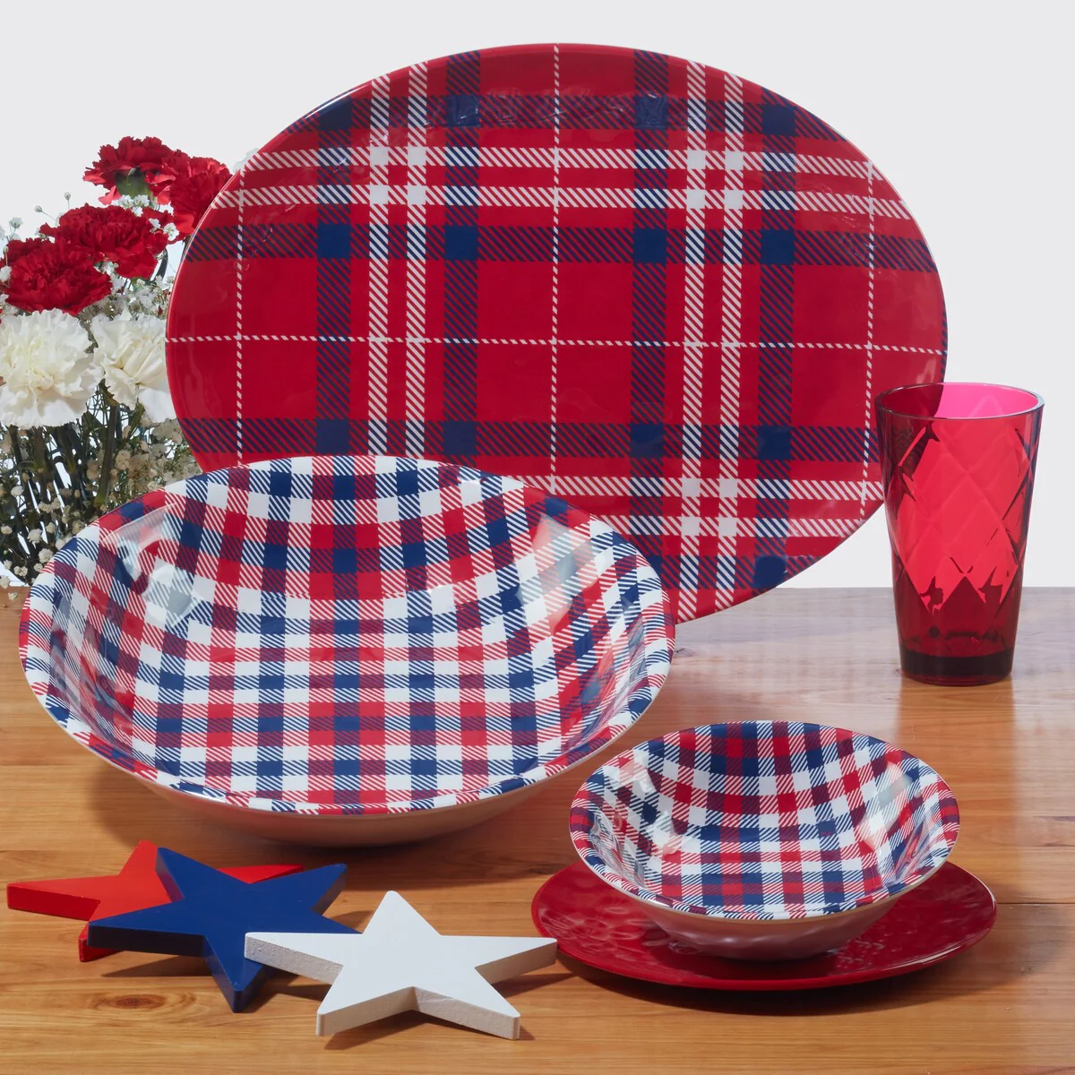 Vivid red, white and blue plaids decorate Certified International’s "Patriotic Plaid" melamine collection. Perfect for celebrating the Fourth of July, these heavyweight 100 % melamine dinnerware and serveware pieces are durable and great for indoor and outdoor dining and entertaining.