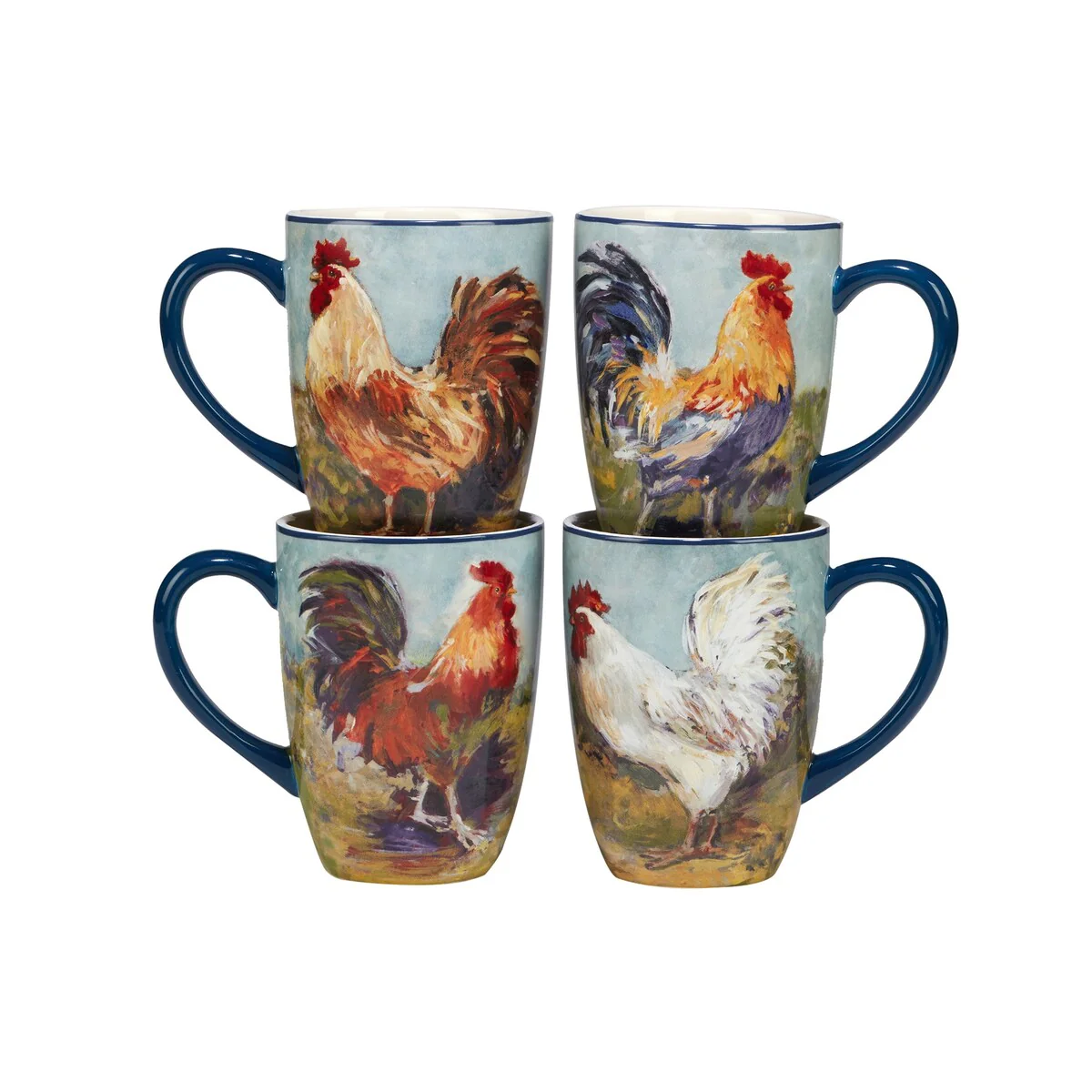 Certified International’s Rooster Meadow 16 Piece Dinnerware Set features colorful roosters in a countryside scene. The 4 assorted mix and match roosters are reproduced on each ceramic piece from the original art painted by the popular designer Susan Winget. Each 16 pc. set includes 4 place settings for your special table. Makes a beautiful display for your hutch or walls. Coordinating serveware, storage and 3-d items are available to complete the farmhouse look in your home!