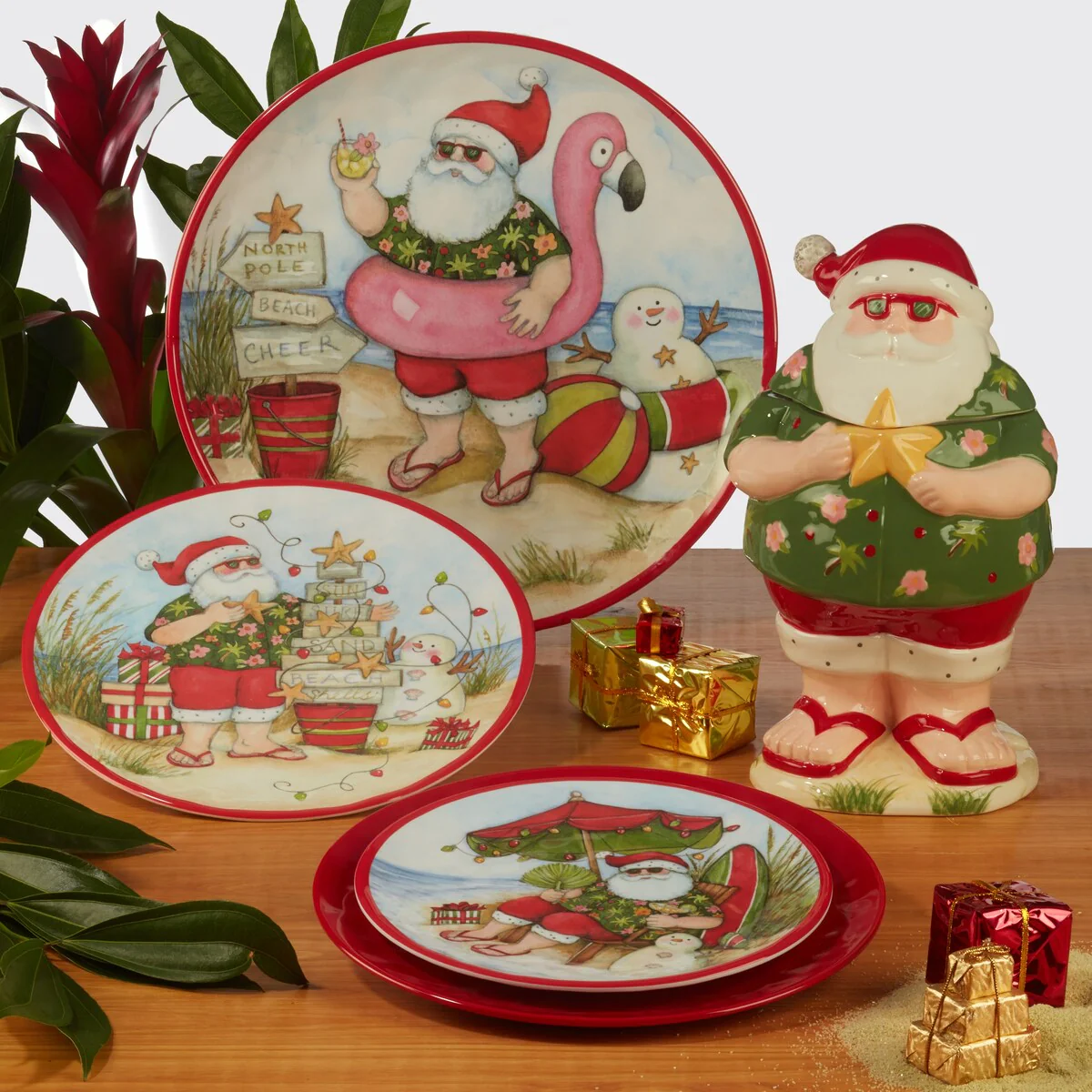 Colorful scenes of Santa enjoying his well-earned vacation at the beach decorate Certified International’s "Santa’s Wish" collection of melamine dinnerware, serveware, ceramic mugs and 3-d cookie jar. Designed by the popular artist Susan Winget, this mix and match assorted images of Santa in his tropical shirt, sunglasses and flip flops will delight your family and friends. The heavyweight 100% melamine is durable and great for indoor and outdoor holiday dining, along with the coordinating ceramic mugs. The sculpted, handpainted Santa Cookie Jar is a fun and decorative way to keep your holiday cookies and treats fresh. Get the matching 3-d Santa S&P set for your holiday table.