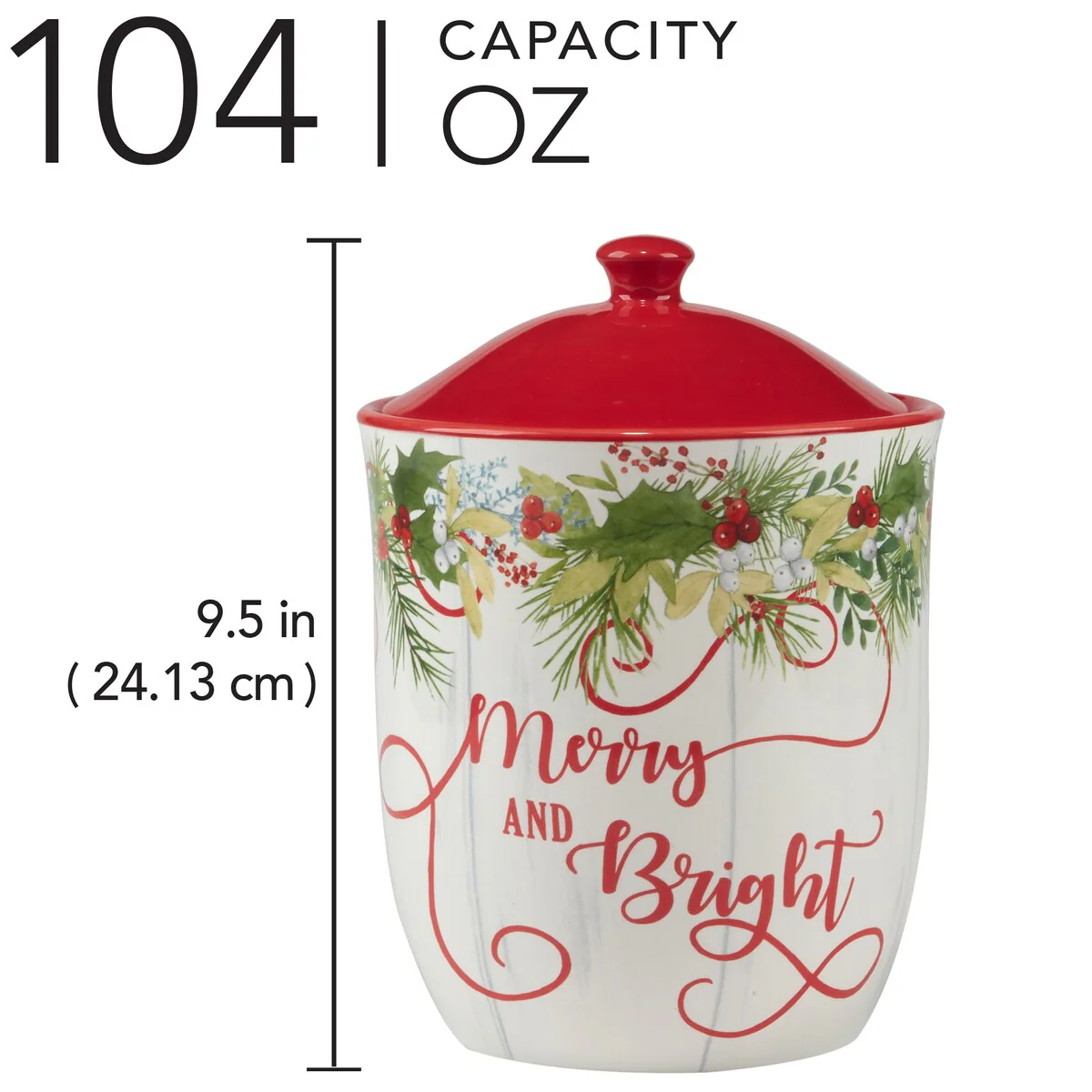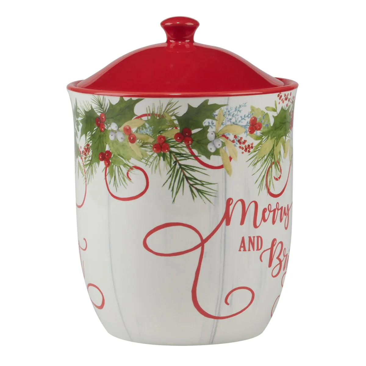 This Winter Greens Ceramic Biscuit Jar is a delightful addition to any holiday-themed kitchen or as a charming seasonal decoration. The jar’s glossy ceramic surface radiates a warm, inviting glow, complemented by the vibrant red lid that seals freshness with a hint of festive cheer. Around the body of the jar, a delicate and artful illustration of traditional holiday greenery – holly leaves, berries, mistletoe, and pine branches – evokes the spirit of the season. The centerpiece of the design is the elegant, red cursive inscription "Merry and Bright," which is not just a warm wish but a promise of the joy that this piece brings to your home.