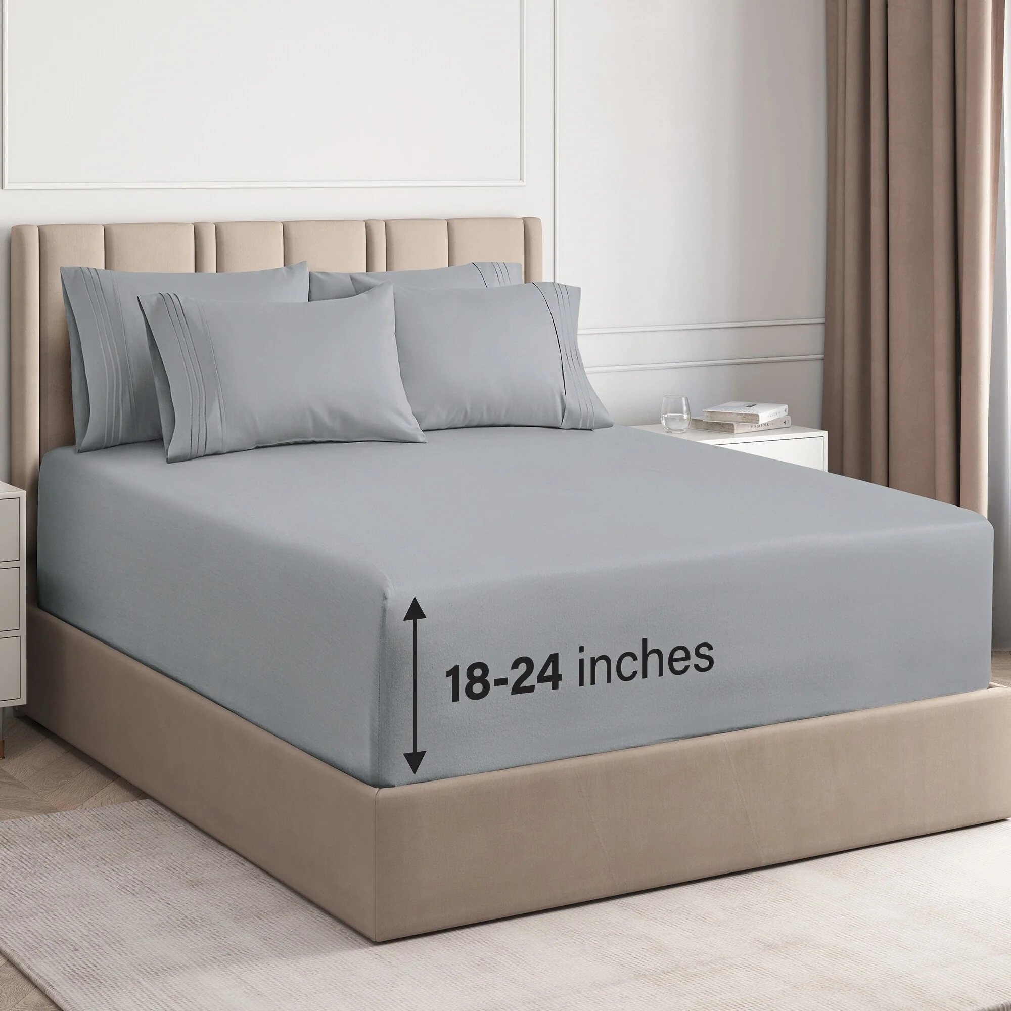- 6 PIECE SHEET SET: This bed sheet set comes with 1 fitted sheet, 1 flat sheet, and 4 pillowcases with beautiful decorative embroidery designs on each pillowcase.