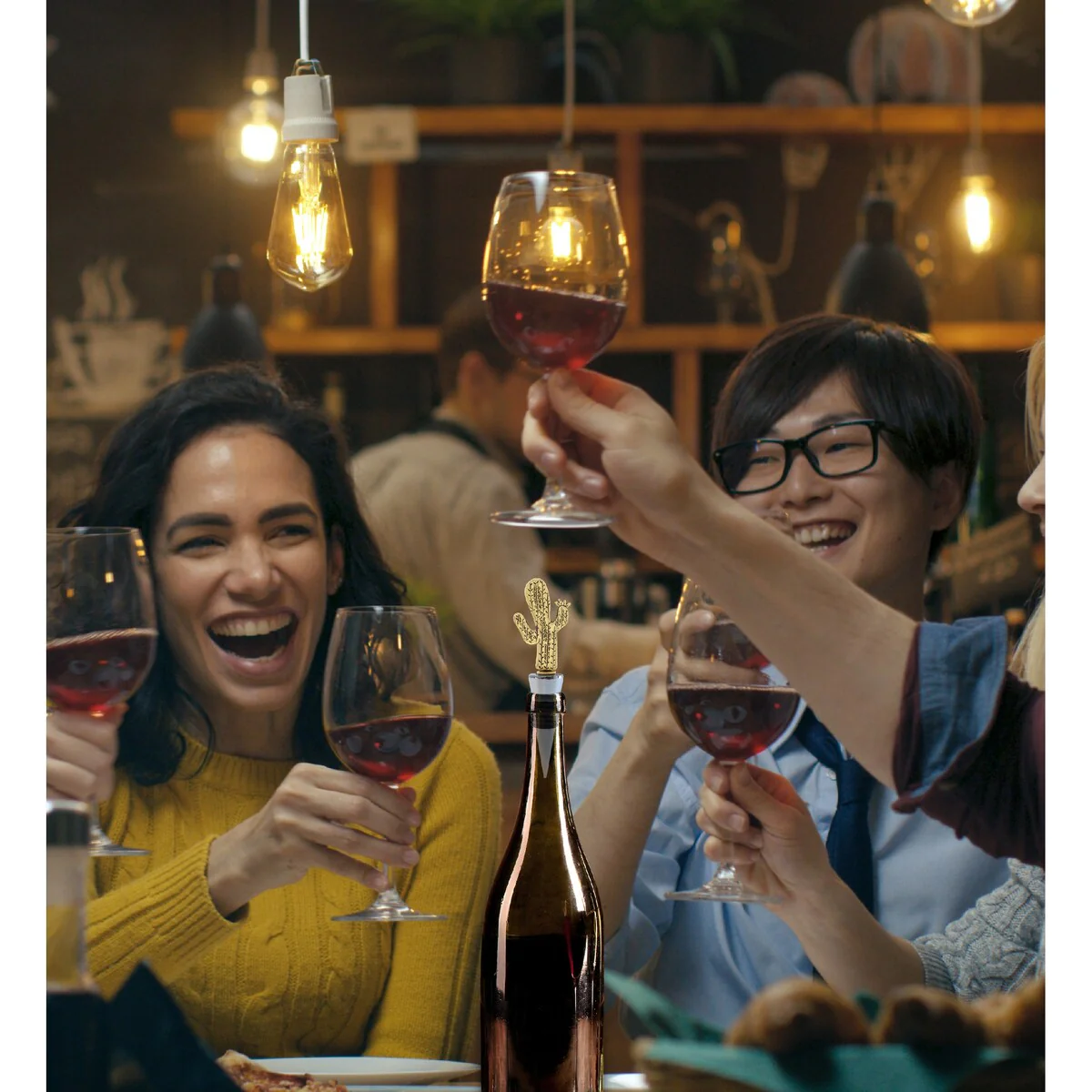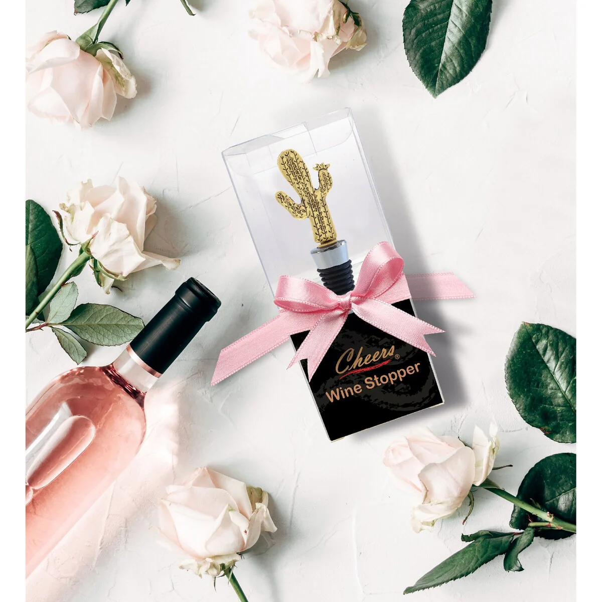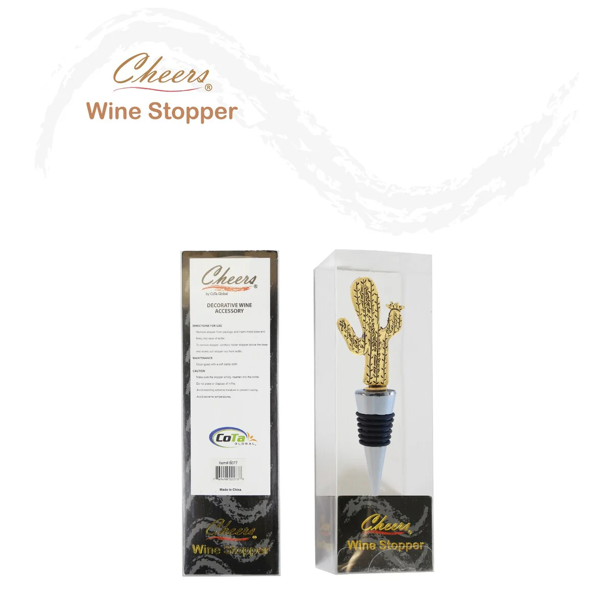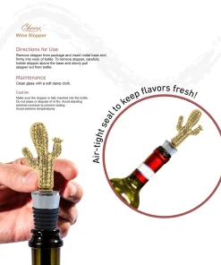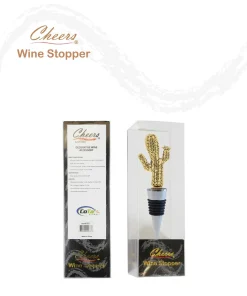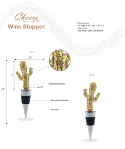 - INCLUDED WITH THE PURCHASE OF DECORATIVE WINE STOPPER – 1 Cheers reusable Gold Cactus Wine Bottle Stopper, a beautifully molded cactus metal figure on top of a chrome base, wrapped with a black rubber liner for a snug fit. Insert the rubber end firmly in the neck of the bottle for an airtight seal. 3-in-1 zinc alloy cork keeps drinks fresh, displays elegance, and turns into a conversation piece. The cactus wine plug measures 1.3? x 0.75″ x 4.6″.