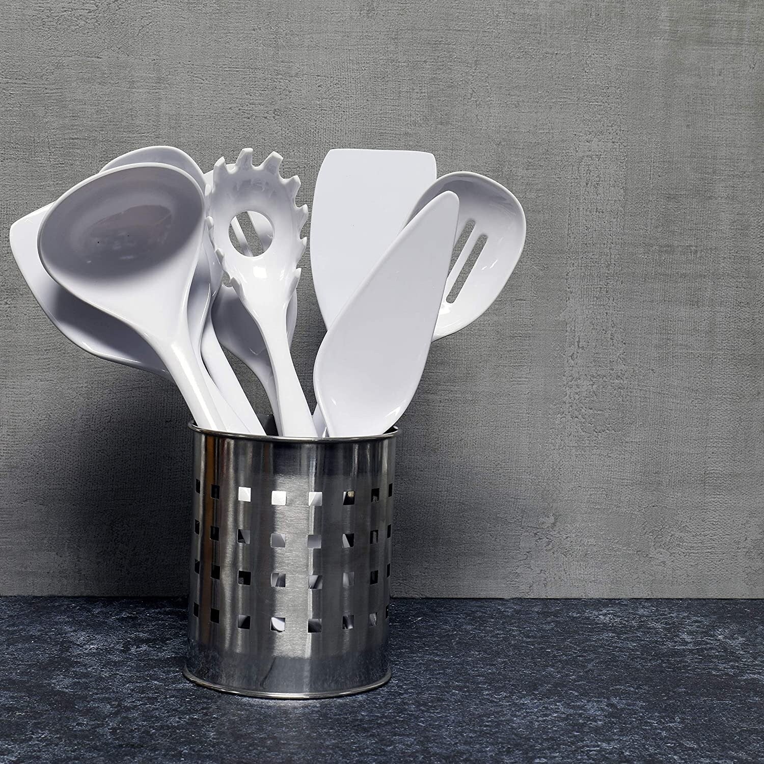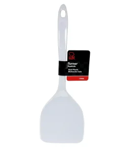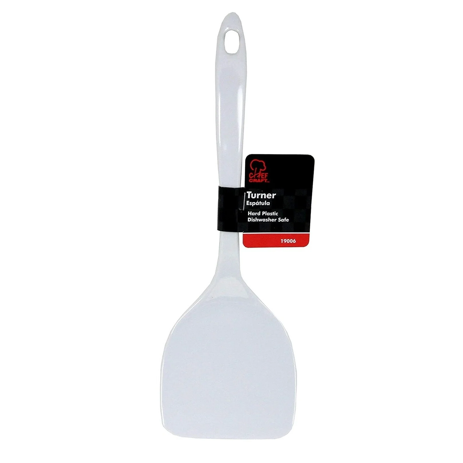 Chef Craft’s line of Melamine Kitchen Utensils is both simple and sleek. They come in either black or white and do not scratch nonstick pans. The handle shape and lightweight design make them easy to use over long periods of time. The firm and thin nature of this turner/spatula makes it ideal for flipping and cooking many different foods including eggs, pancakes, and more.Made of durable melamine. Dishwasher safe. Measures 11" long overall. Turner head measures 3.5" wide by 3.5" deep.