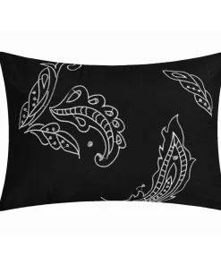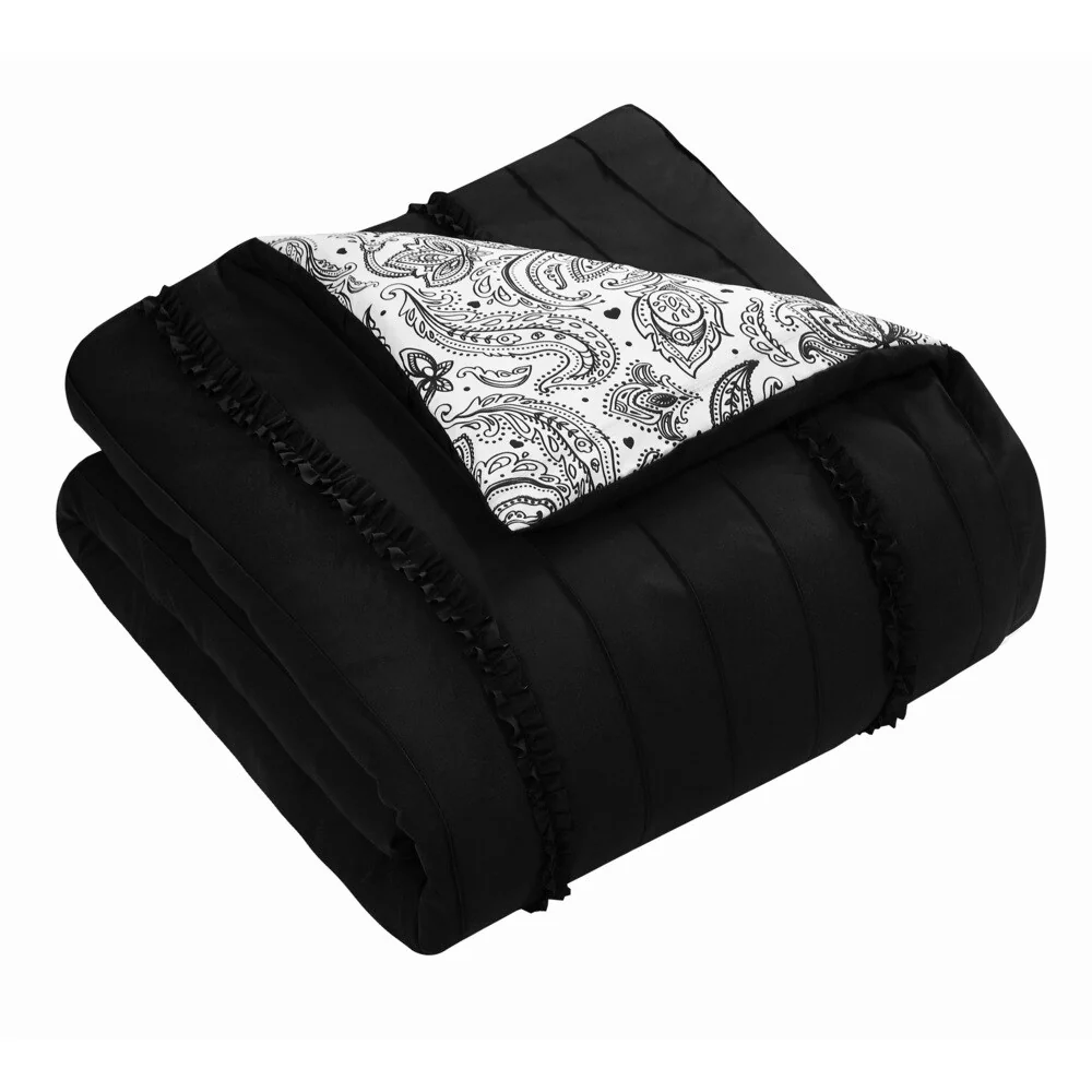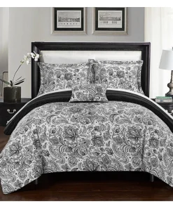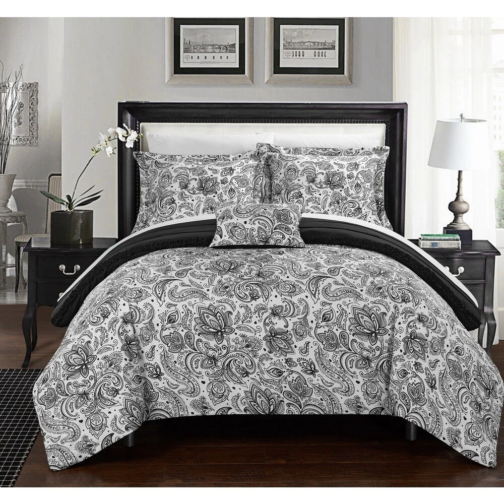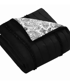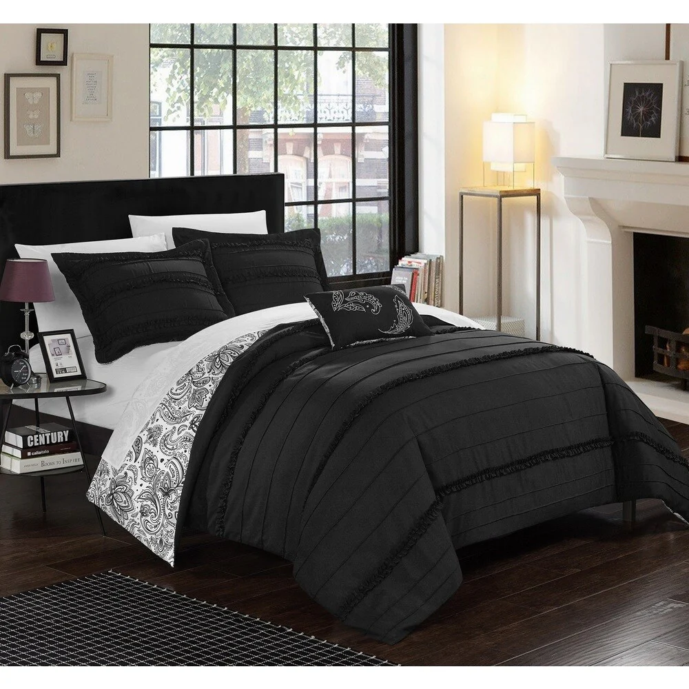 Upgrade the sophistication level of your bedroom with this Atticus four-piece duvet cover set from Chic Home. Solid black reverses to a classic paisley floral print on the other side, allowing a refreshing change on a moment’s whim. Ruffled accenting adds vintage charm, while the included decorative pillow features an embroidered design to complement the duvet and shams.