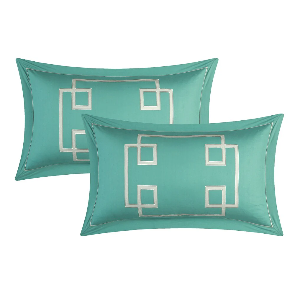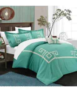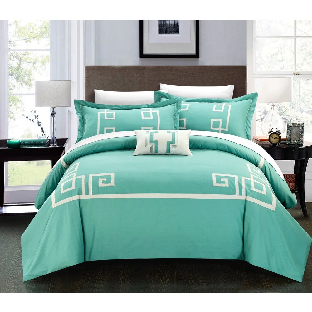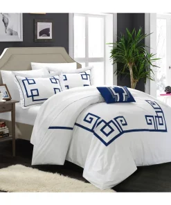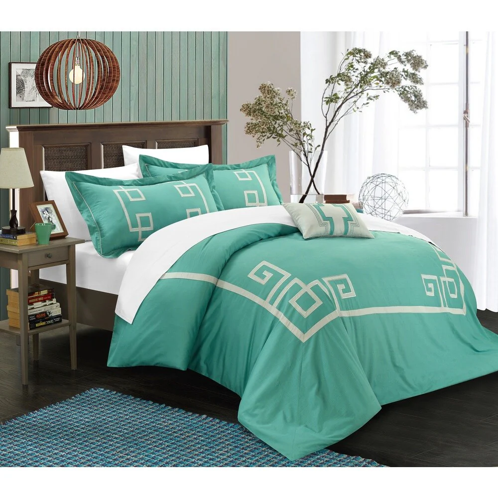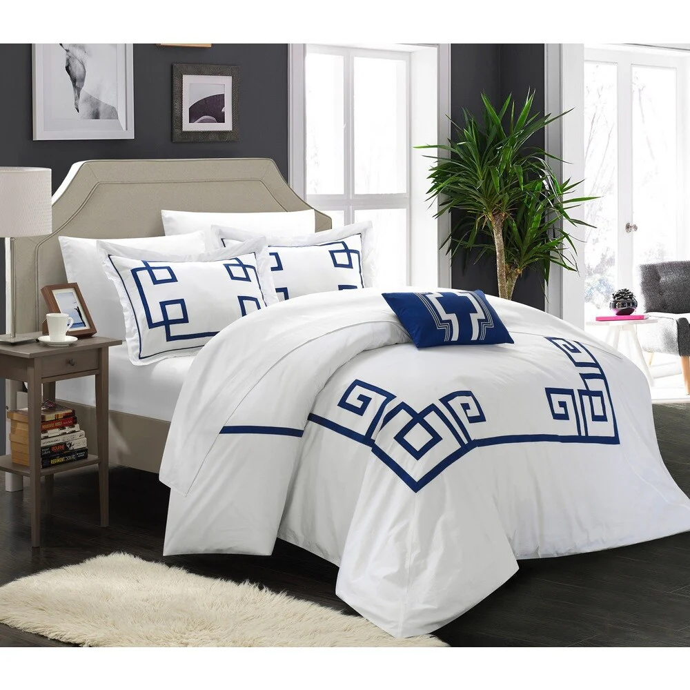Create a colorful bedroom look with this Chic Home Downton four-piece duvet set. Featuring geometric patterns for contemporary charm, this duvet set has embroidered details on the pillow for visual texture. Crafted from 100-percent cotton with a thread count of 200 for superior comfort, this duvet set is machine washable for fuss-free care.