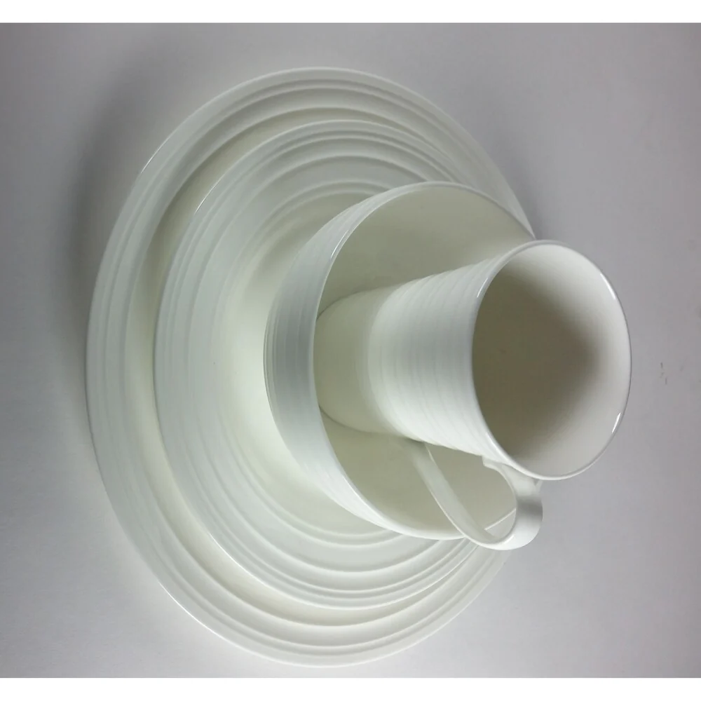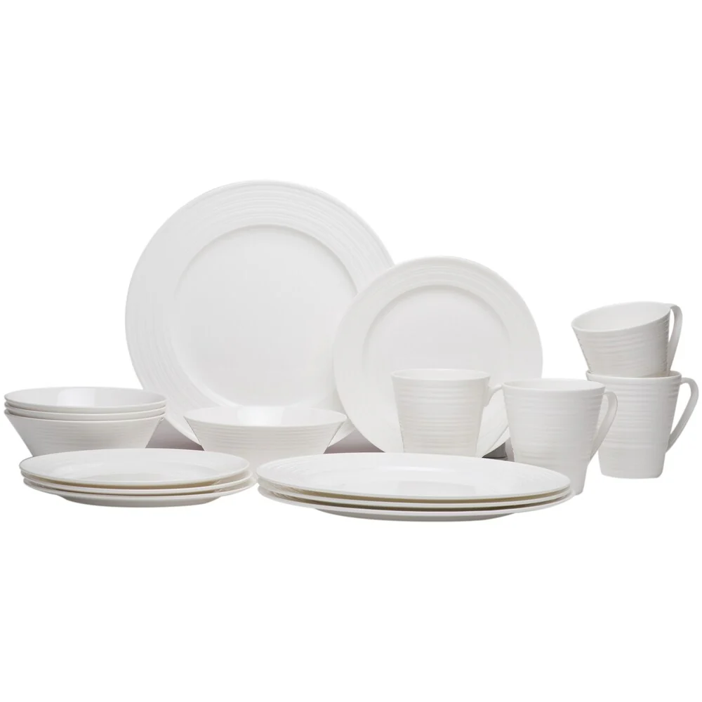 This Christopher Knight Set is simple yet sophisticated with its Swirl-like texture on the rim of the dinner plate. Â Enjoy all your meals with this white bone china dinnerware set.
