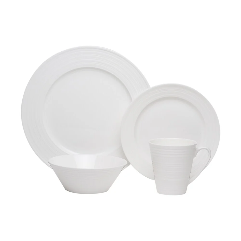 - 16Pc Set – 4 dinner plates, 4 salad plates, 4 coupe bowls, 4 mugs