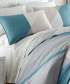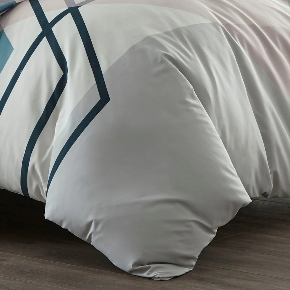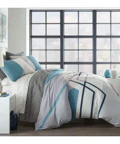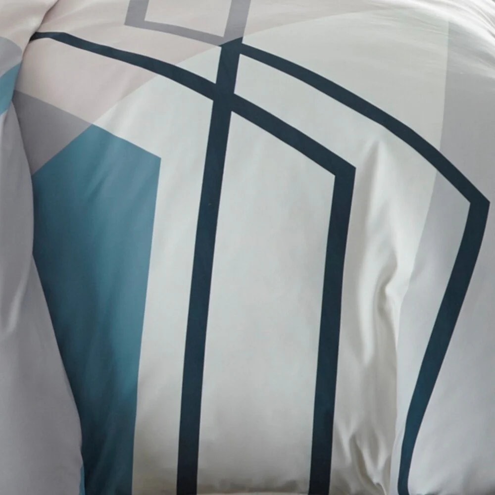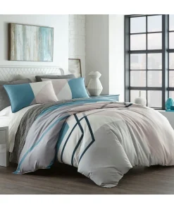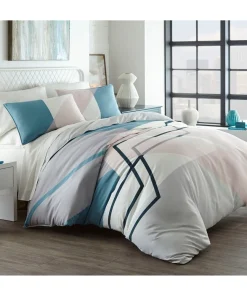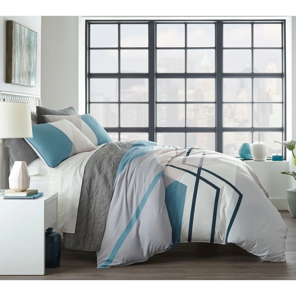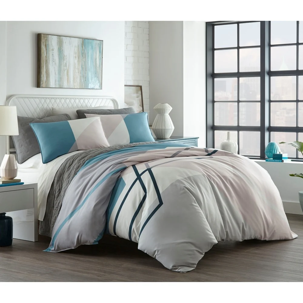 Bring modern sophistication to your bedroom décor with the City Scene Thornton Duvet Cover Set. Intersecting lines of pastel blue and pink on a crisp white ground, add a modern touch to this digitally printed ensemble. Constructed with soft and silky microfiber, the Thornton duvet cover reverses to solid baby blue that contrasts the abstract face. Artistic and urbane, this bed set will provide a fresh update with a contemporary attitude for any bedroom. Coordinating shams mimic the face of the duvet cover and feature a European closure. Duvet cover features a zipper closure with additional inner corner ties and is machine washable for easy care. Duvet insert sold separately.