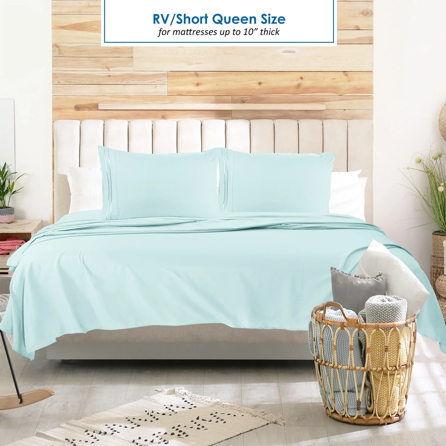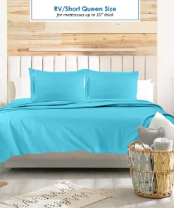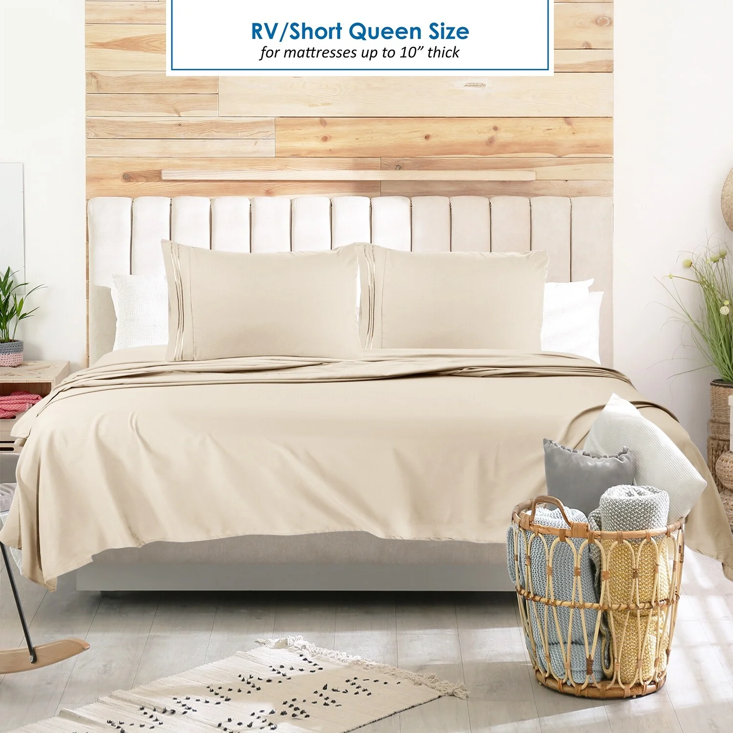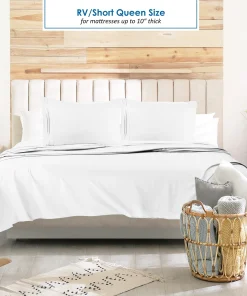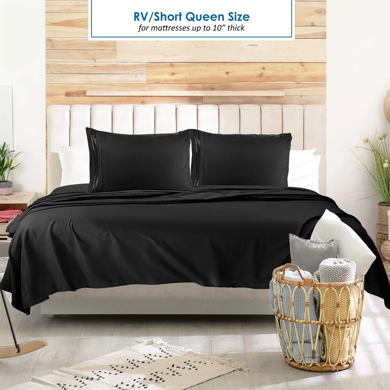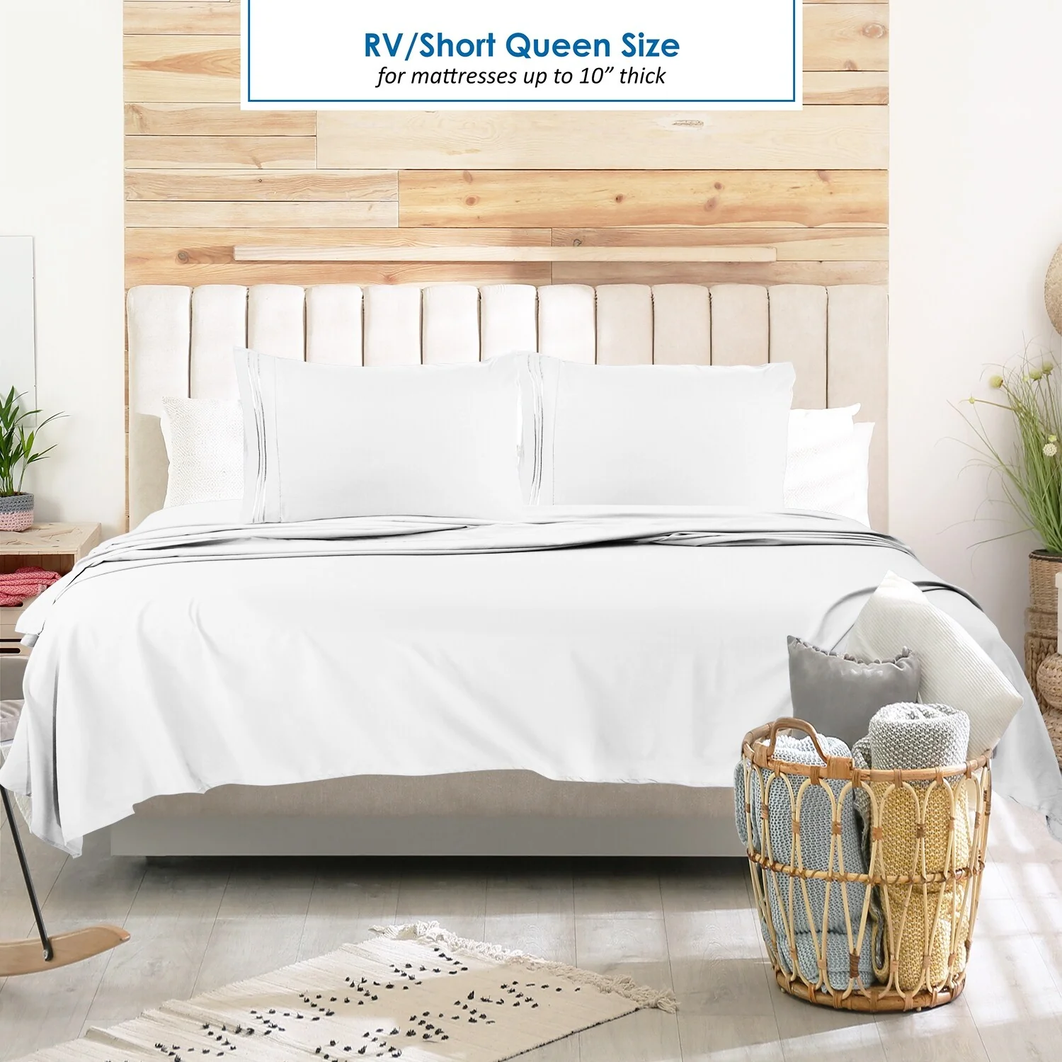 - RV/Short Queen Size 6 Piece Set – Includes: 1 flat sheet 90" x 99", 1 fitted sheet 60" x 75", and 4 pillowcases 20" x 30". Fitted sheet for mattress up to 10, with an elastic all around the sheet.
