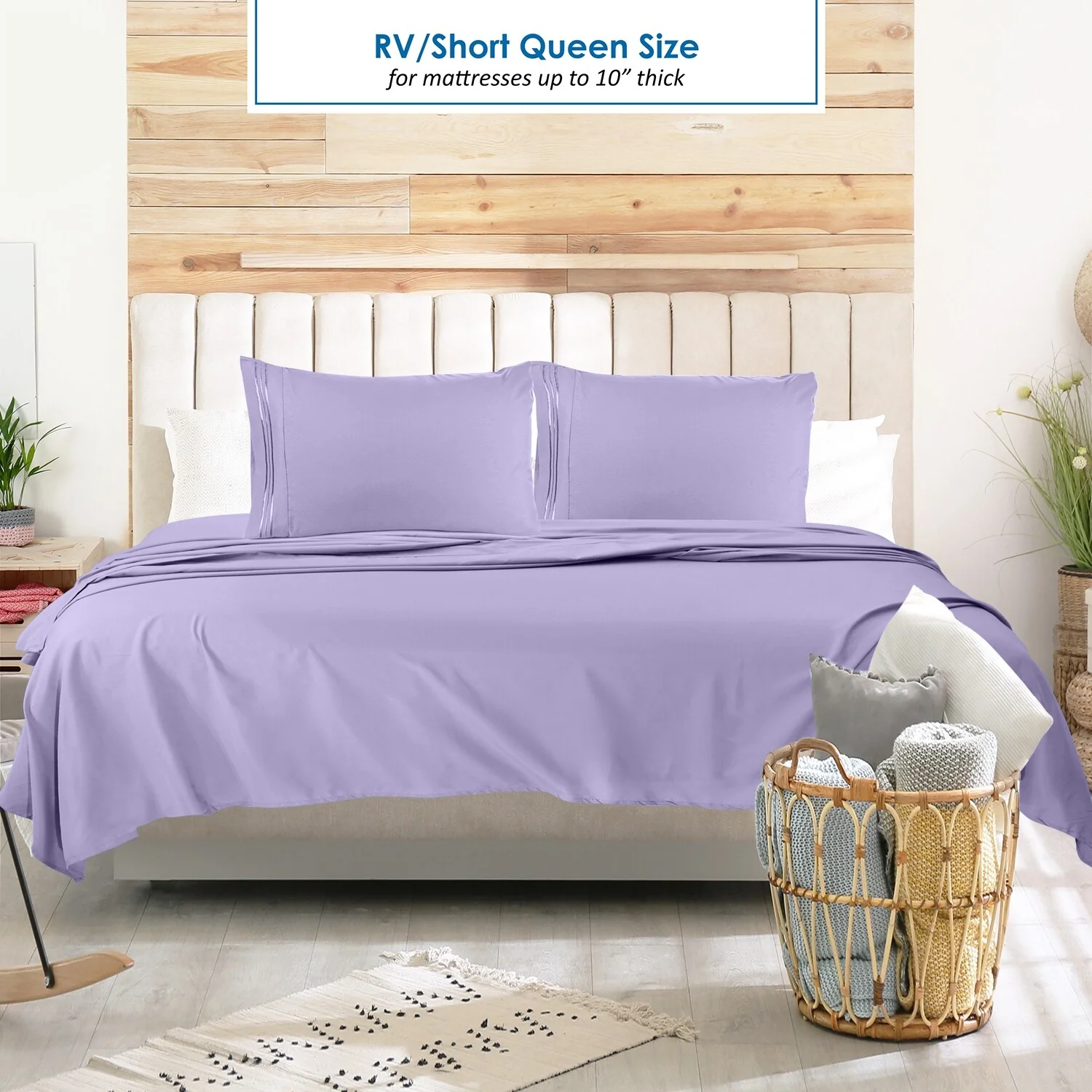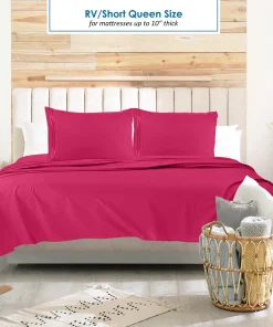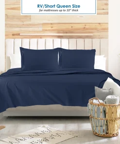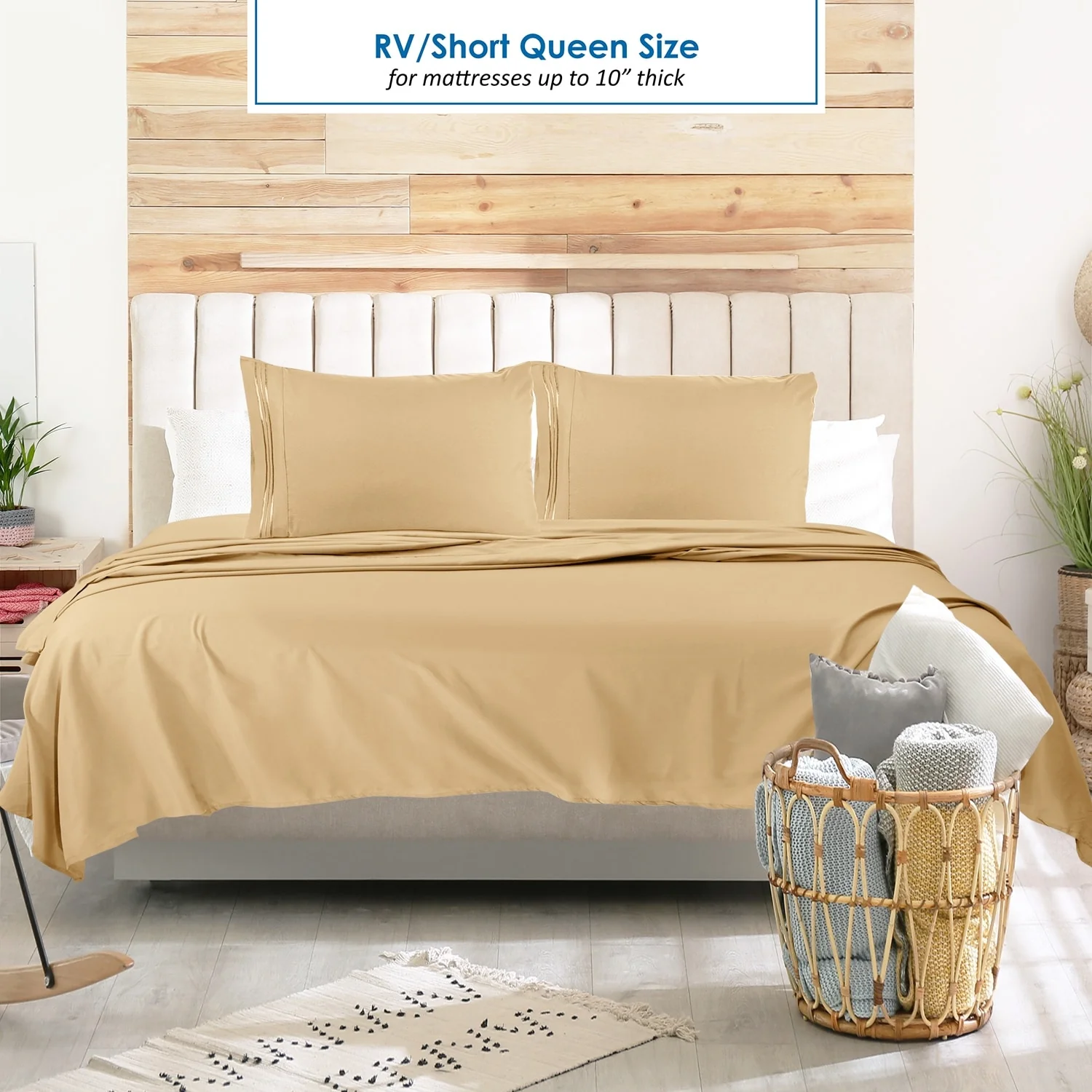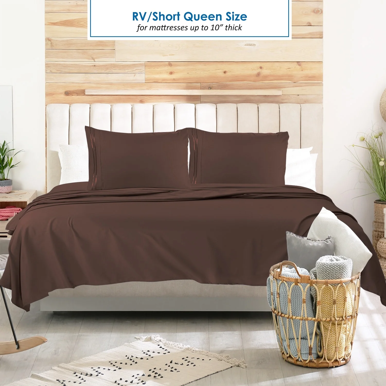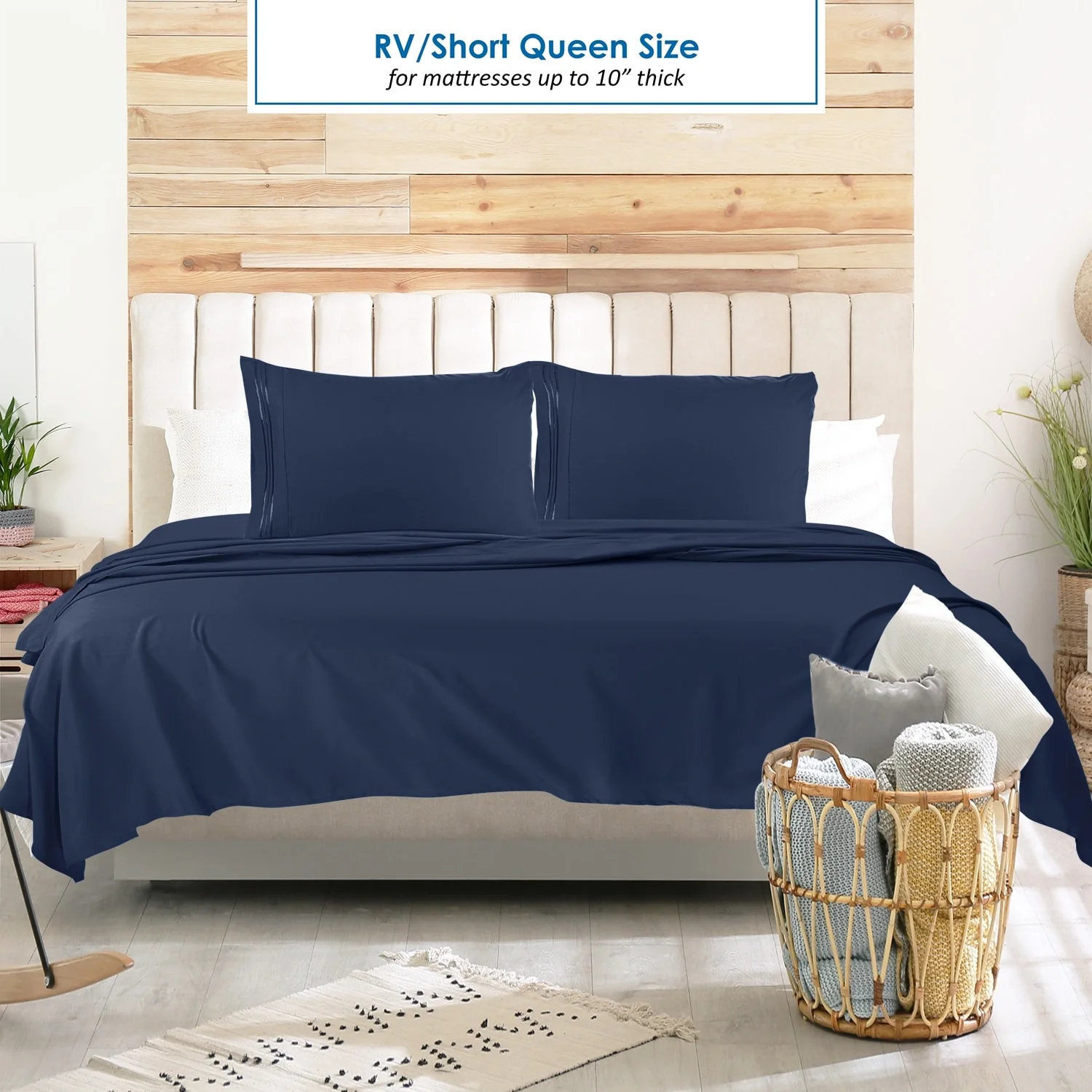 - RV/Short Queen Size 6 Piece Set – Includes: 1 flat sheet 90" x 99", 1 fitted sheet 60" x 75", and 4 pillowcases 20" x 30". Fitted sheet for mattress up to 10, with an elastic all around the sheet.