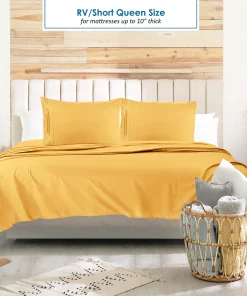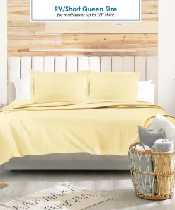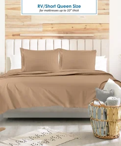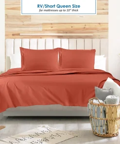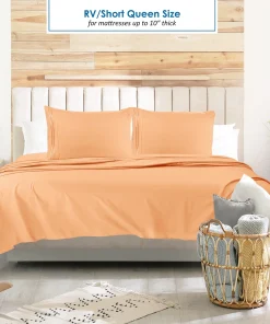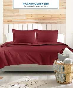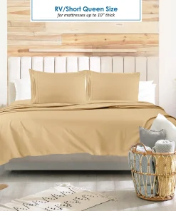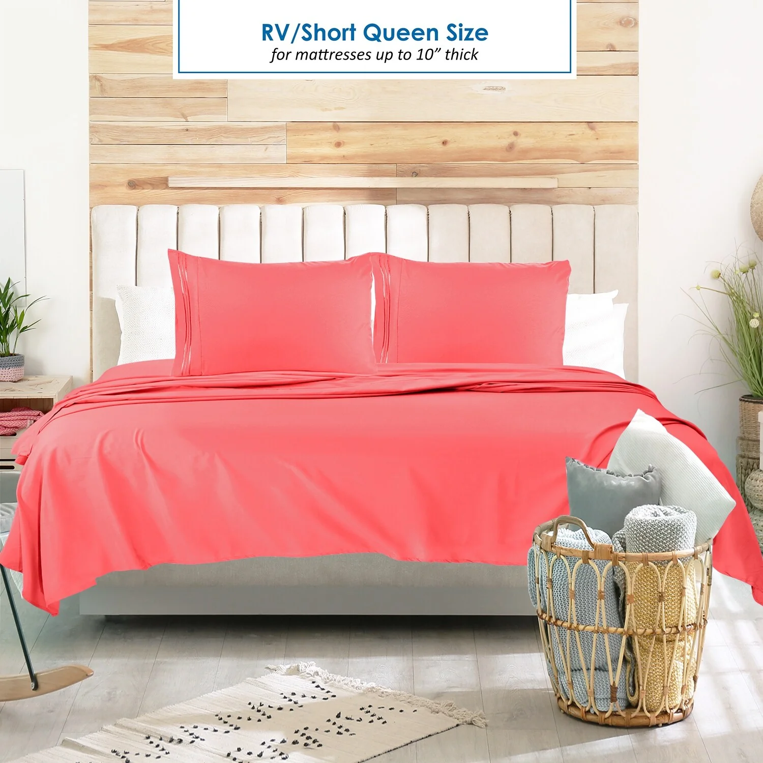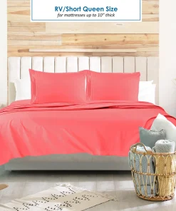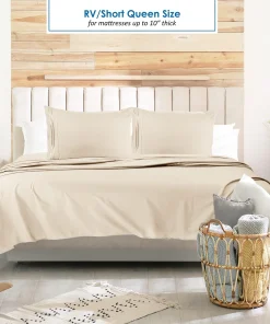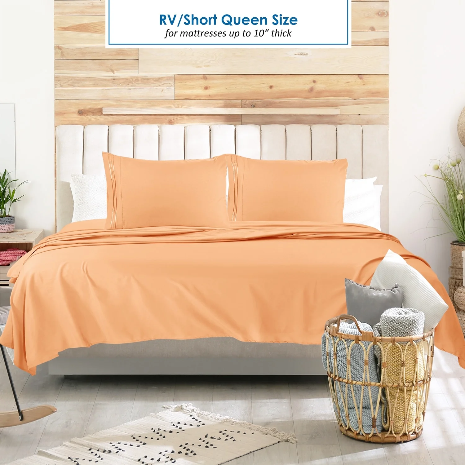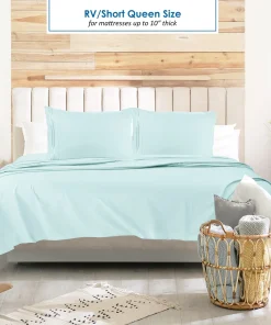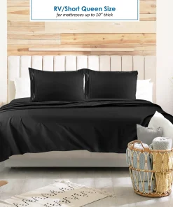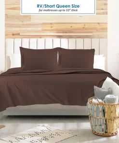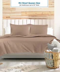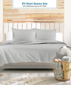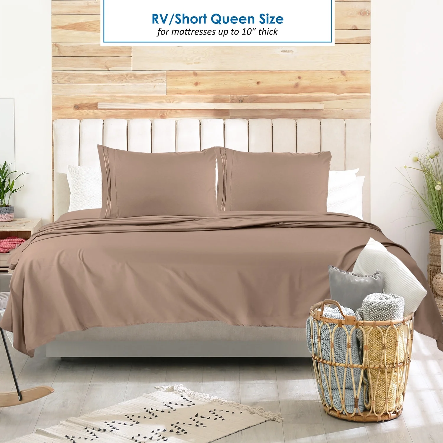 - RV/Short Queen Size 6 Piece Set – Includes: 1 flat sheet 90" x 99", 1 fitted sheet 60" x 75", and 4 pillowcases 20" x 30". Fitted sheet for mattress up to 10, with an elastic all around the sheet.