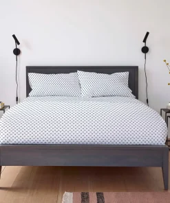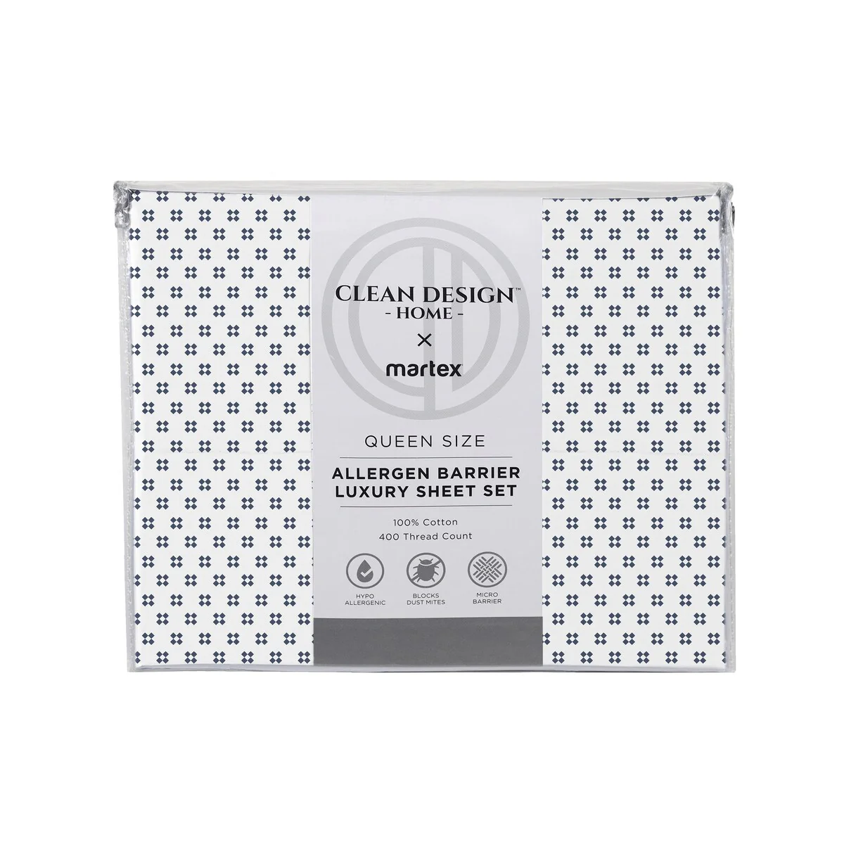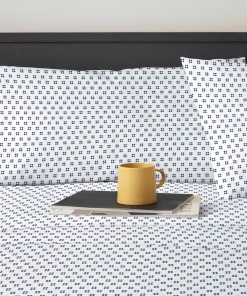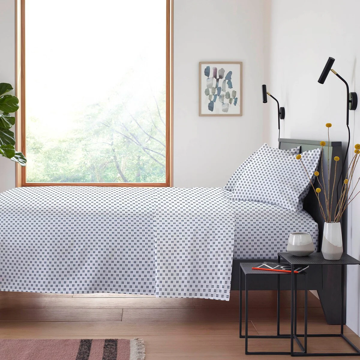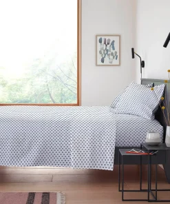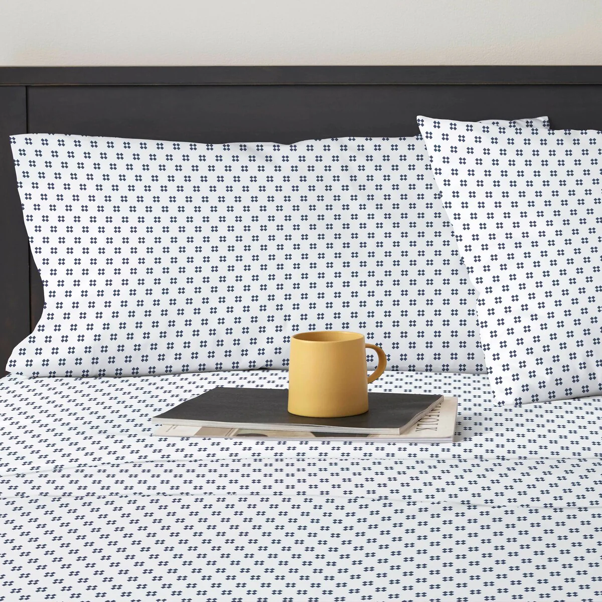 Blue geometric patterns are printed on crisp percale that is wonderfully cool and light on the skin. Our 100% cotton sheet set is expertly woven with unique technology that creates a micro barrier against dust, dander, and other allergy triggers. Clean Design Home is an allergen-aware lifestyle brand curated for a healthy home.